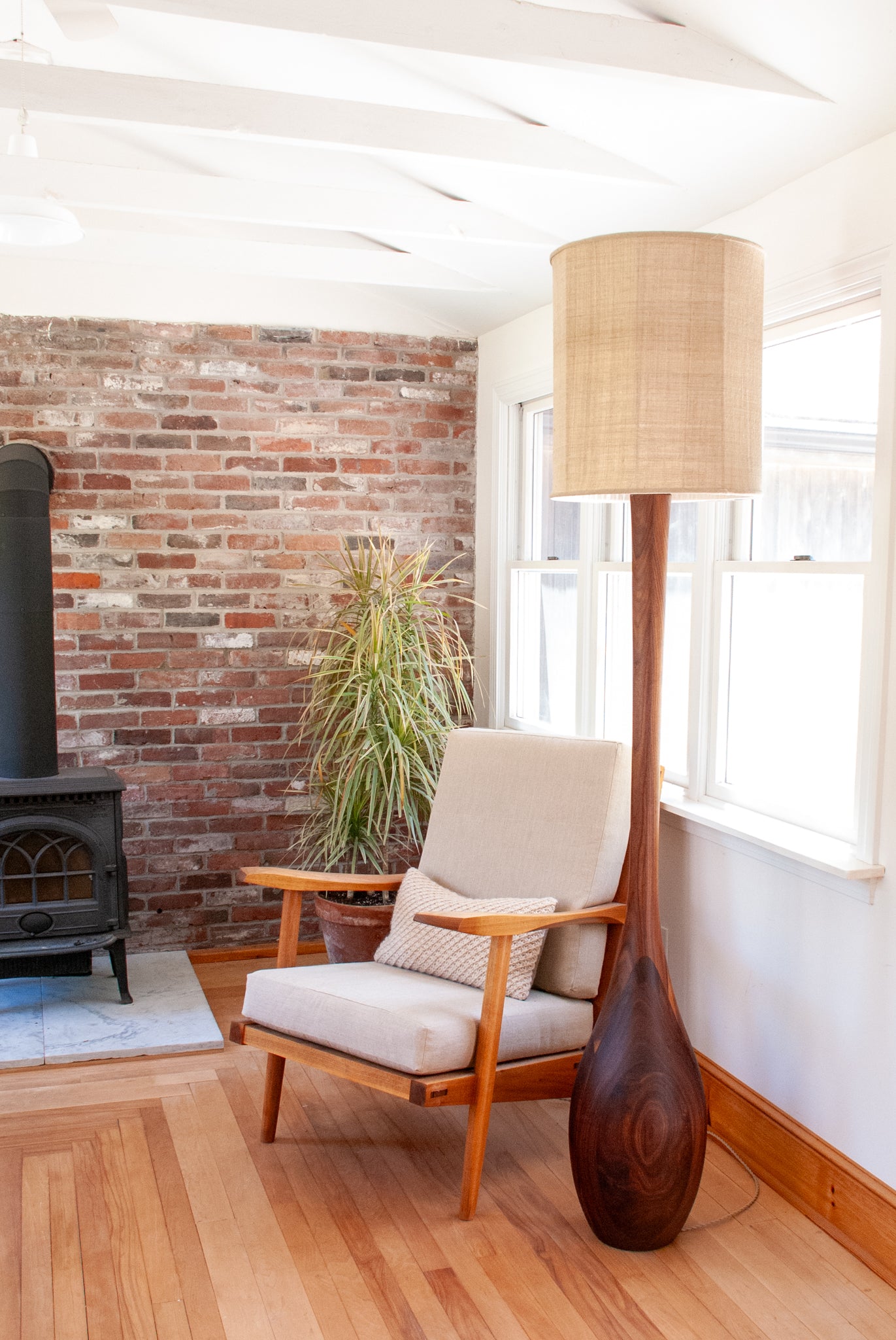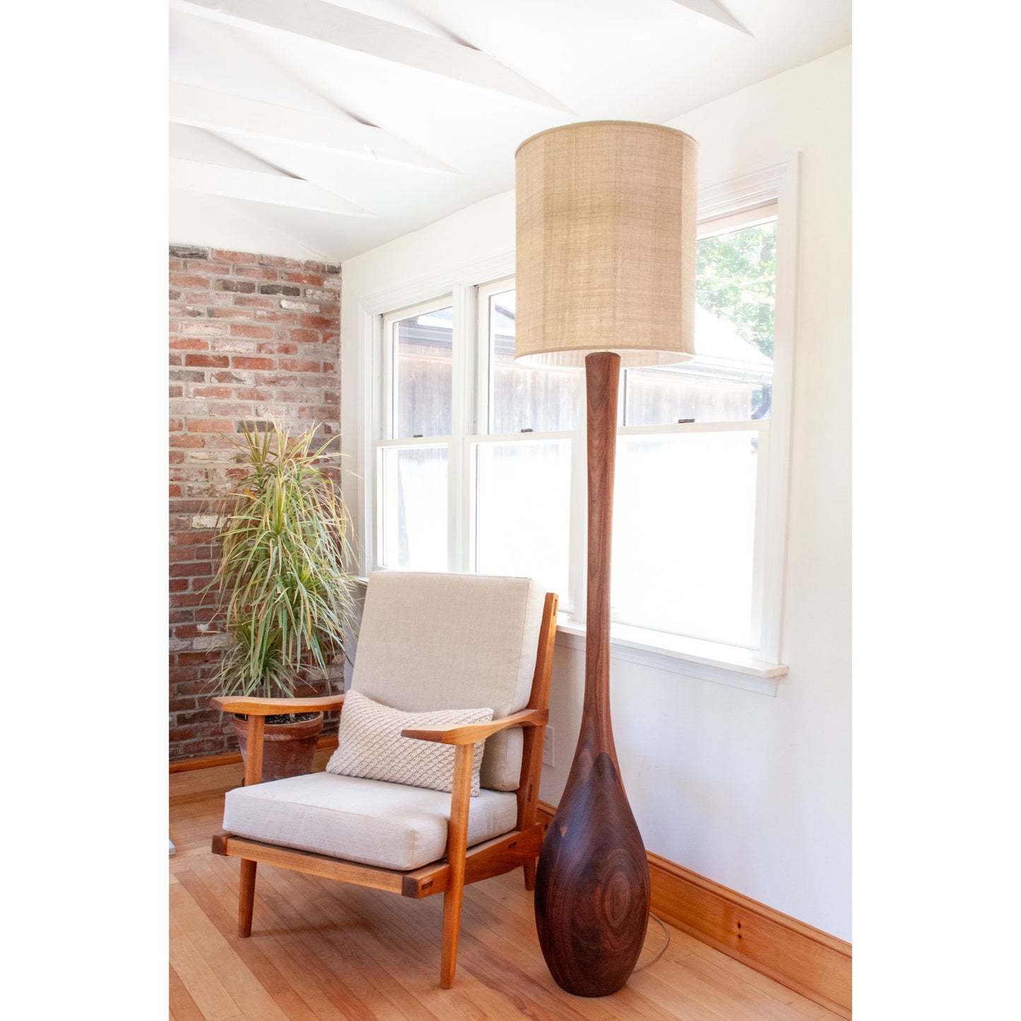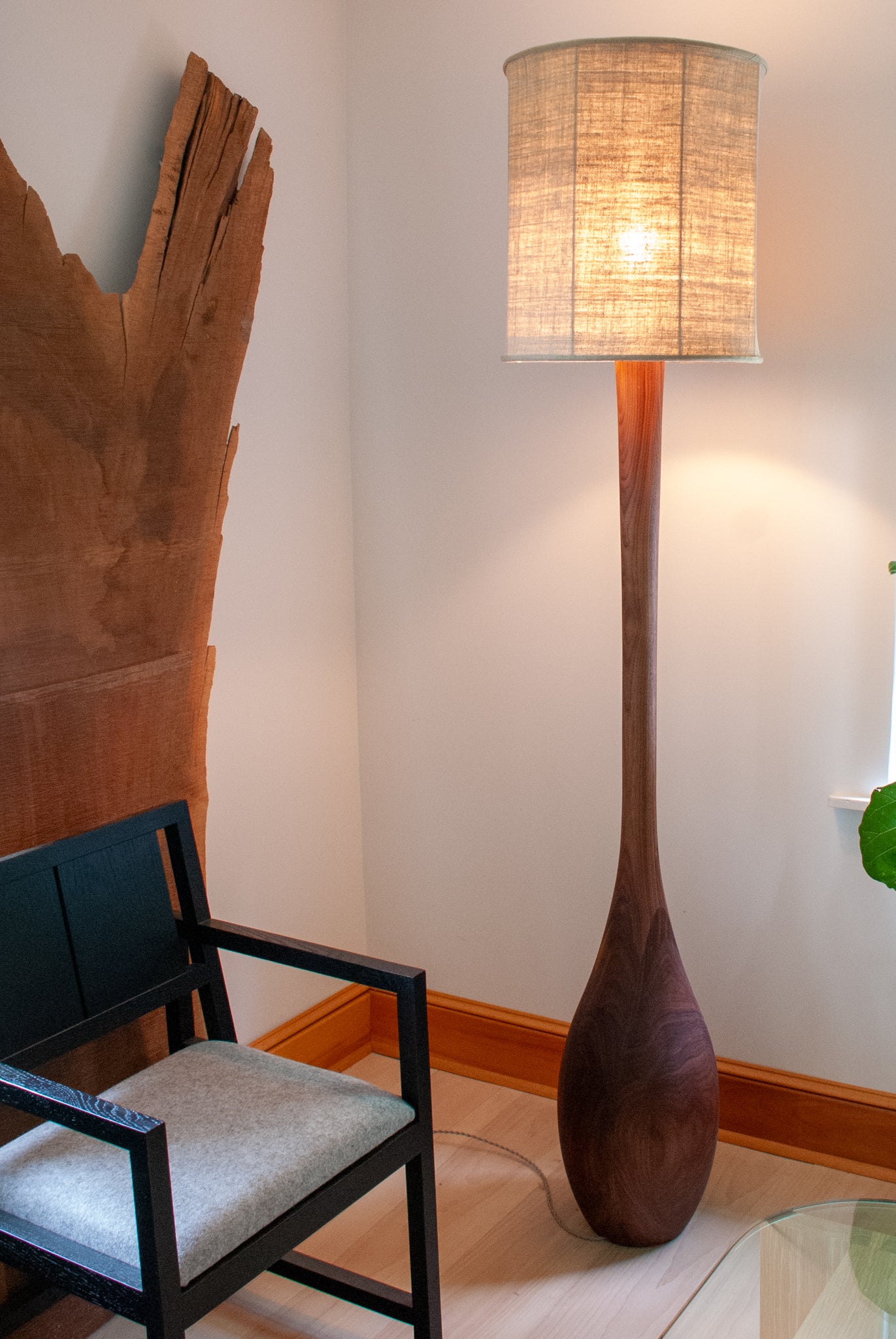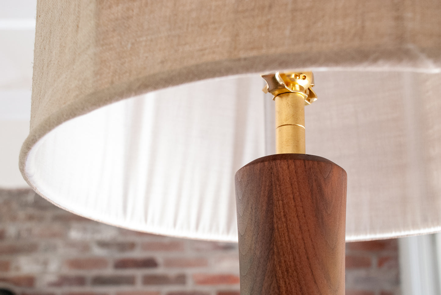 Turned solid wood lamp base with brass fixtures. Shown in walnut with natural oil and wax finish. Hand-sewn antique French linen (ca 1890) shade.