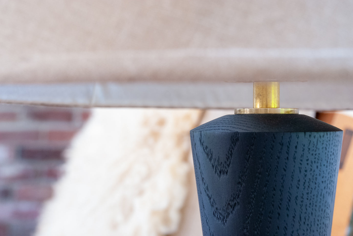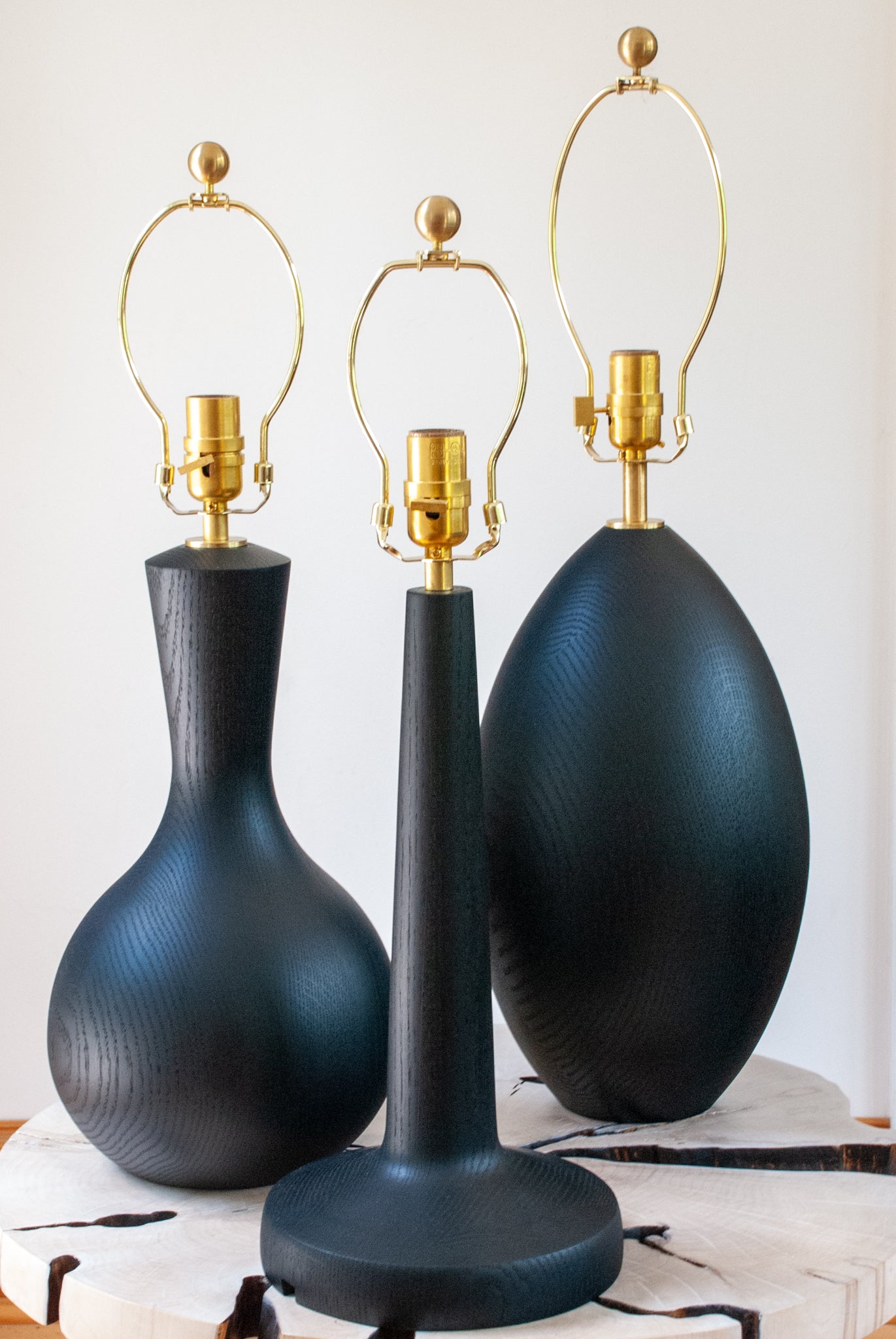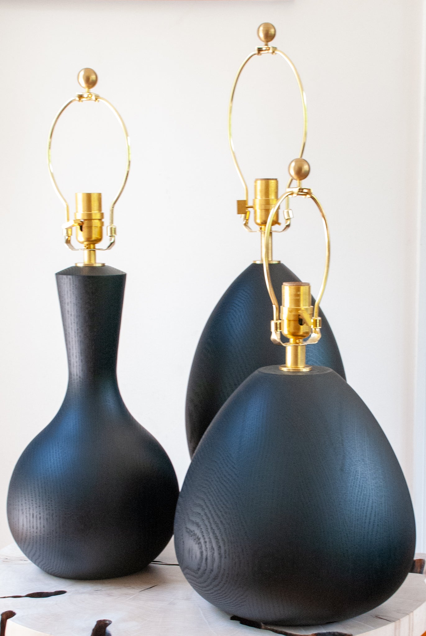 Turned solid wood lamp base with brass fixtures. Shown in ebonized red oak with natural oil and wax finish. Hand-sewn antique French linen (ca 1890) shade.