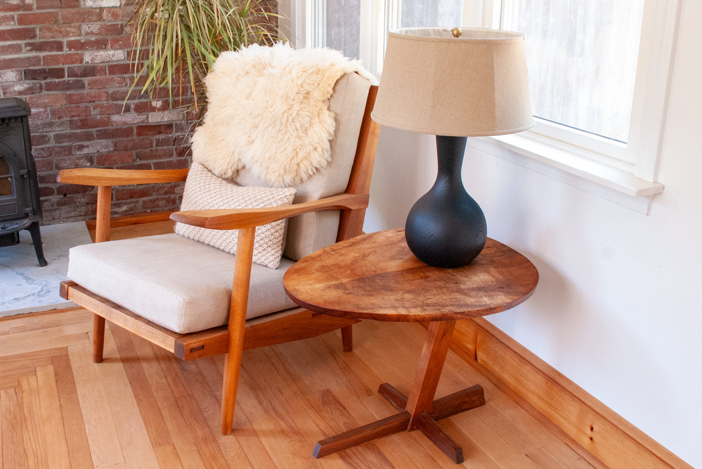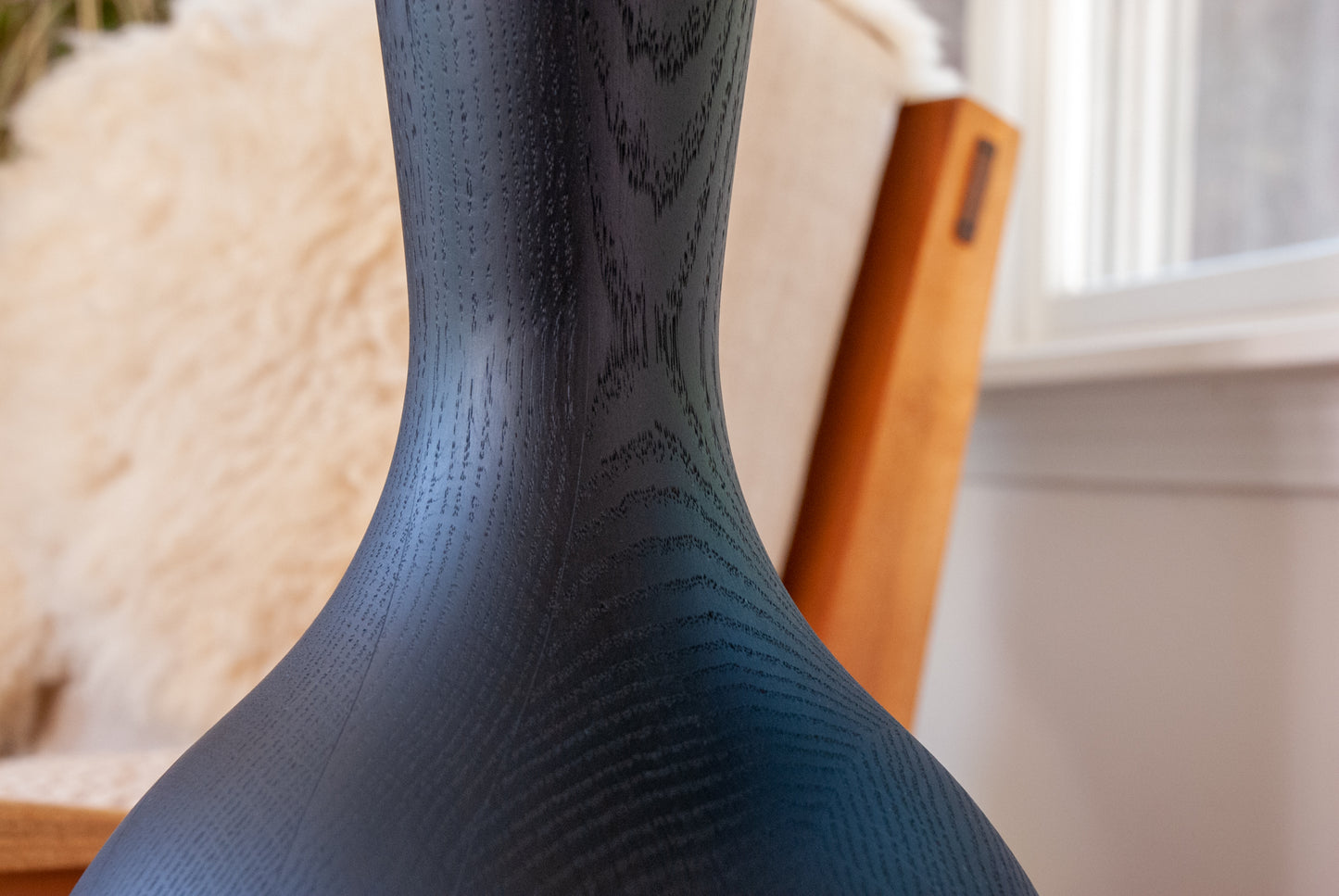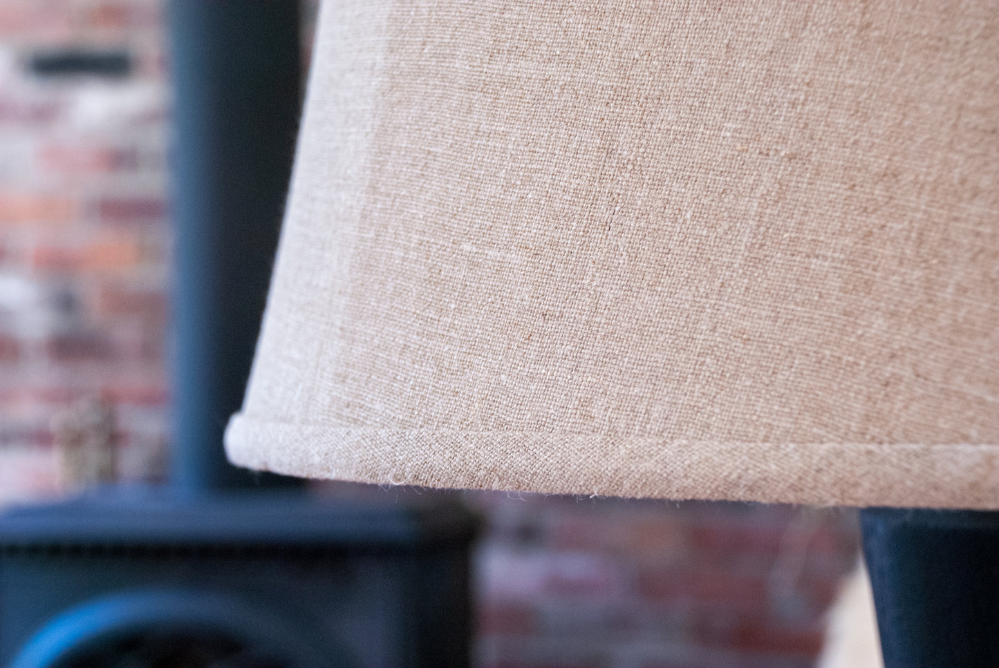 Turned solid wood lamp base with brass fixtures. Shown in ebonized red oak with natural oil and wax finish. Hand-sewn antique French linen (ca 1890) shade.