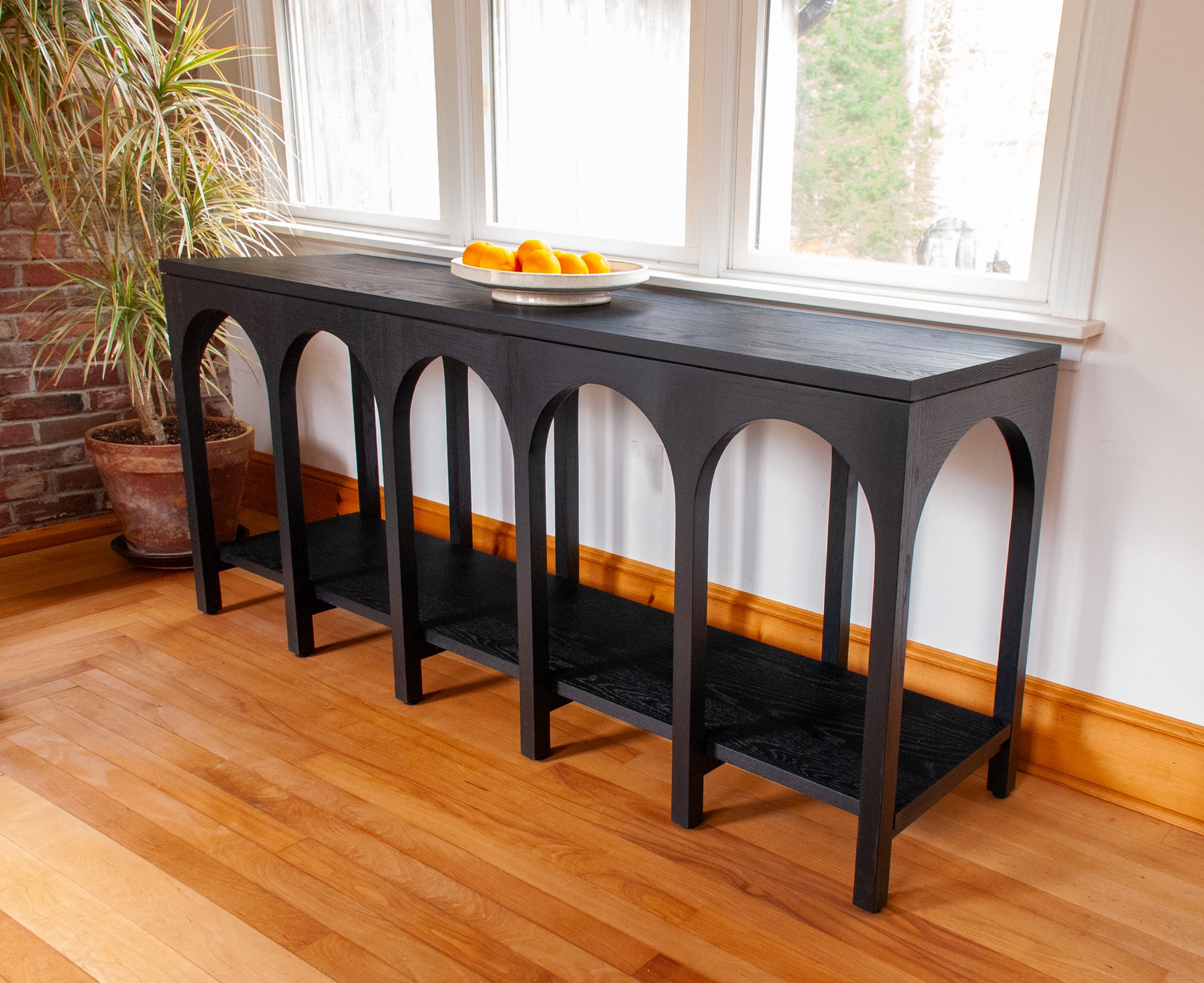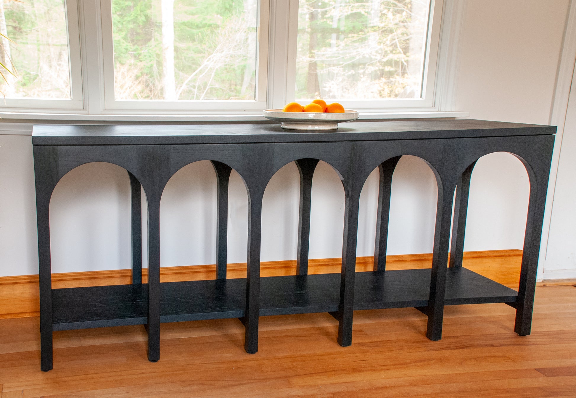 Solid red oak construction using traditional joinery methods. Ebonized with natural oil and wax finish.