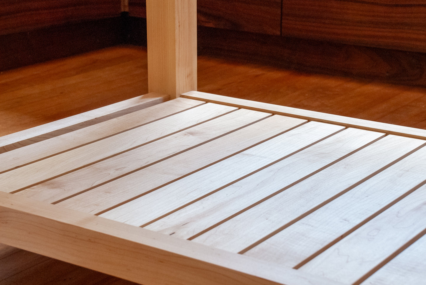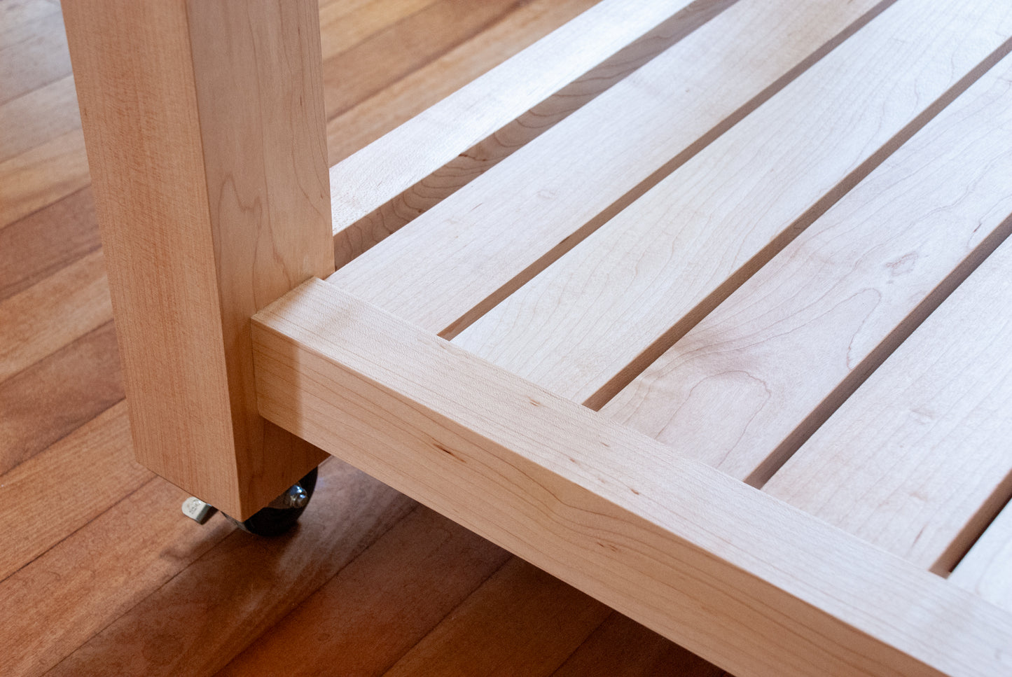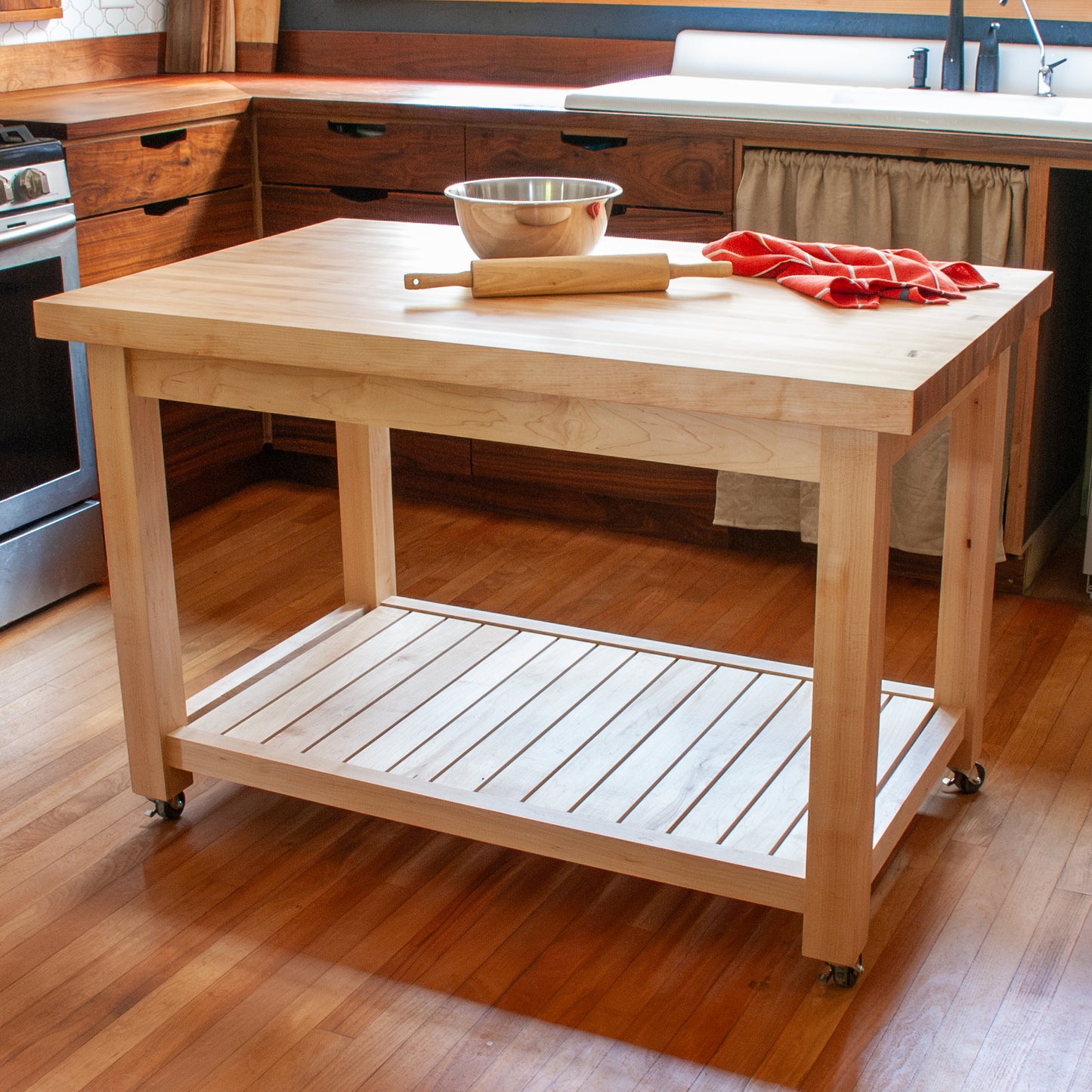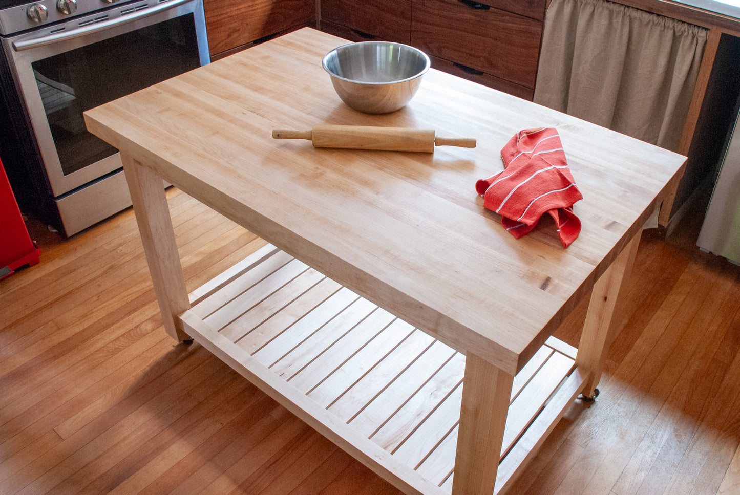 Custom hard maple baking table with butcher block top and mortise and tenon joinery. Locking casters. Natural oil and wax finish.