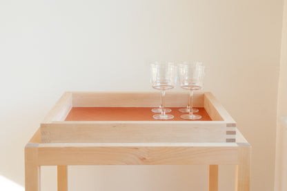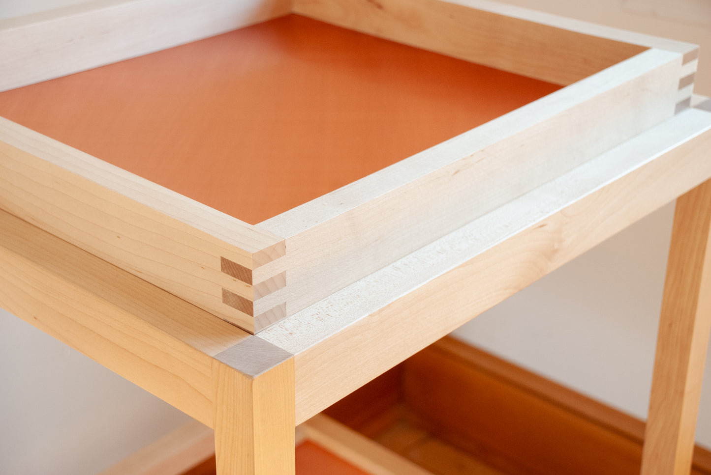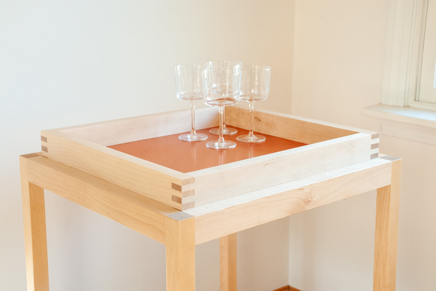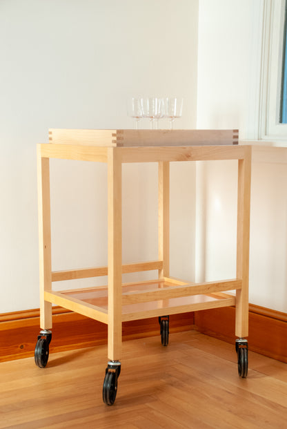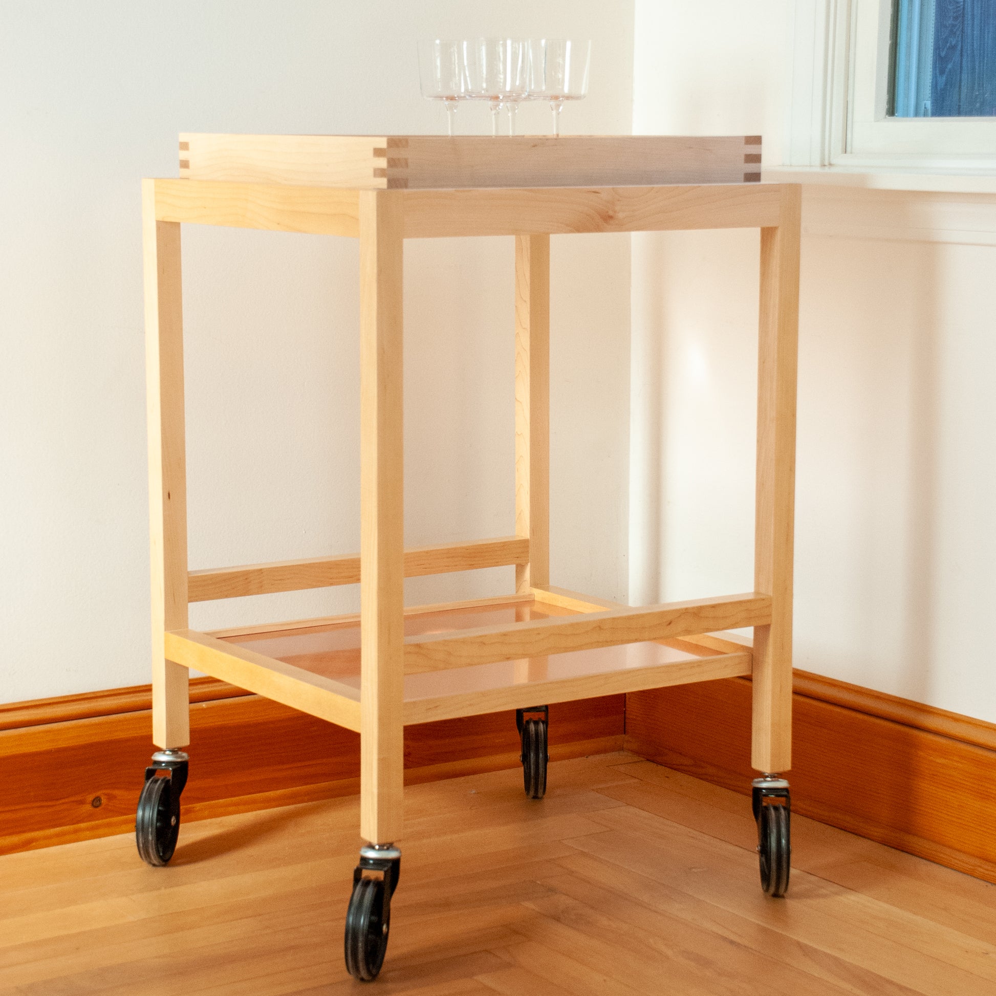 Solid hardwood bar cart with metal tray bottoms and swivel casters. Constructed using traditional finger joints. Shown in maple wood with copper. Also available with brass tray bottoms.
