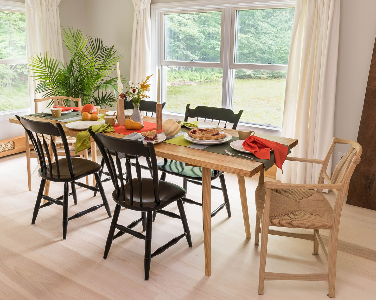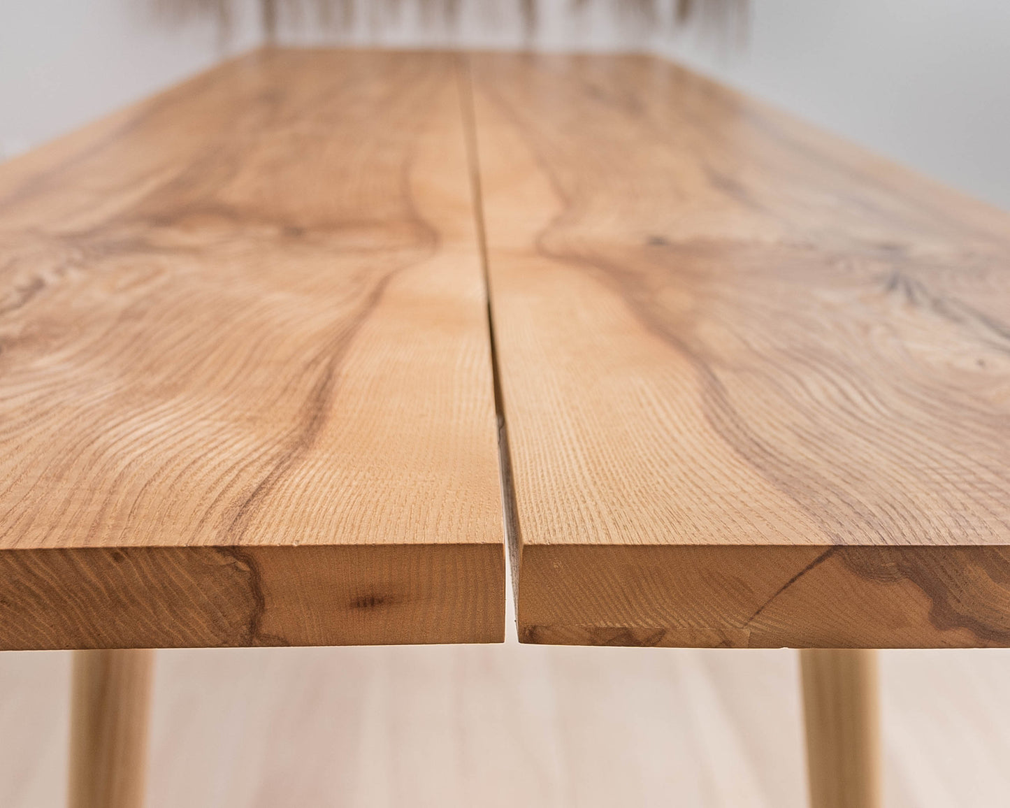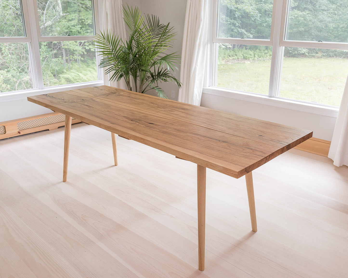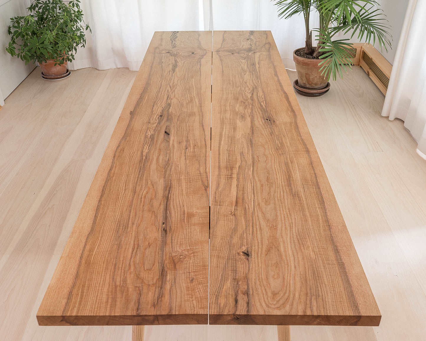 Ash slabs sourced from sawyer in Blue Hill, Maine. Hand-turned, tapered legs are joined with traditional tenons and braces to a 1.5“-thick bookmatched tabletop hand-finished with natural oil & wax.