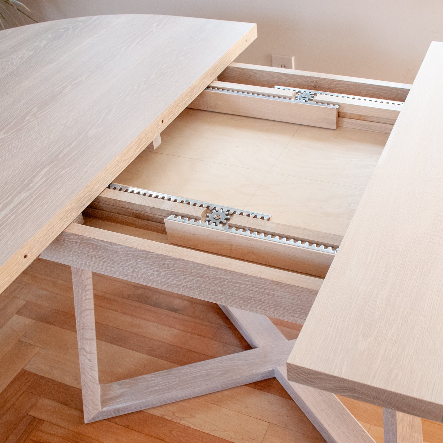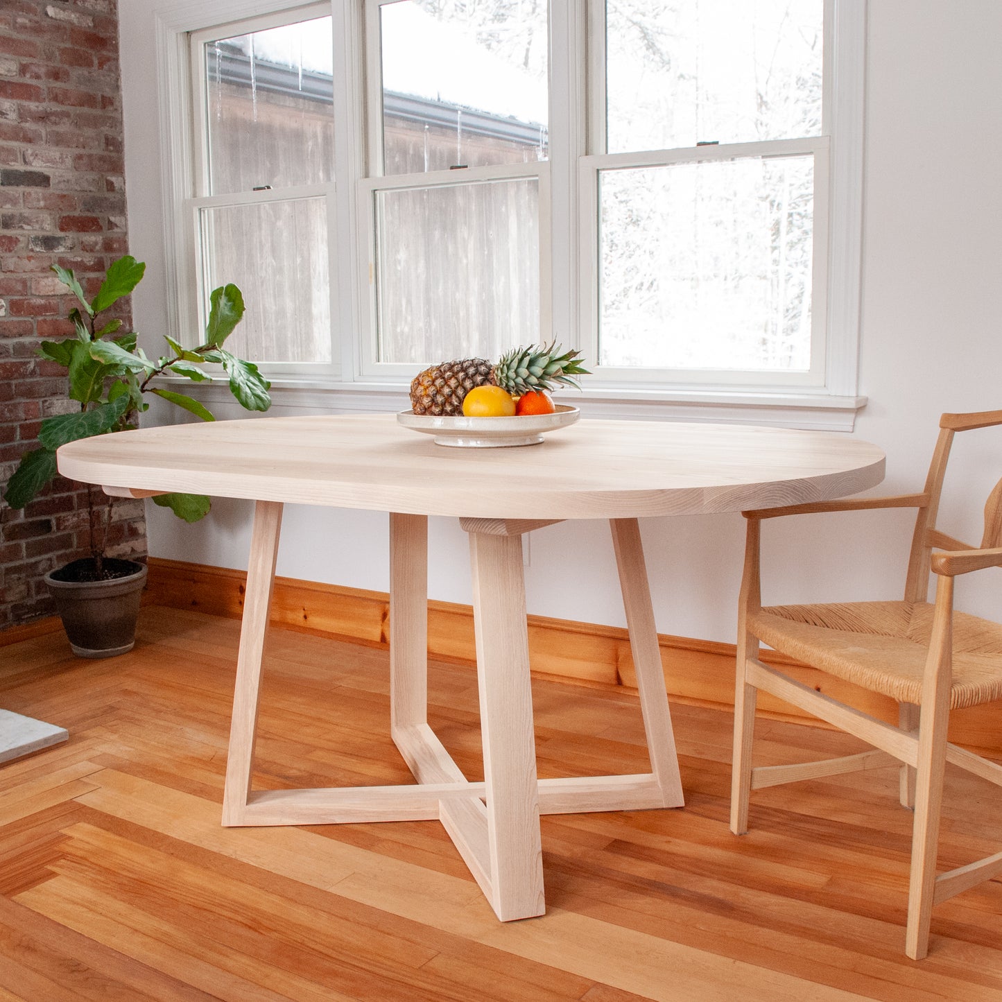 Oval dining table with a 1.5” thick solid wood tabletop. Hand-finished with natural oil & wax. Pictured in washed ash. Available in solid and extendable options.