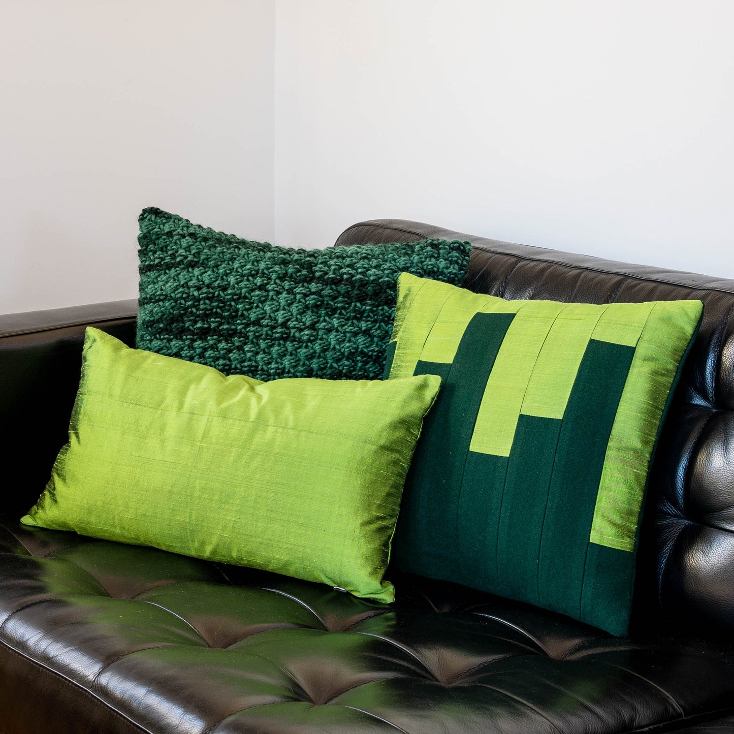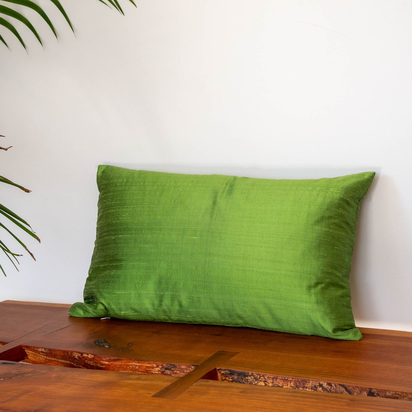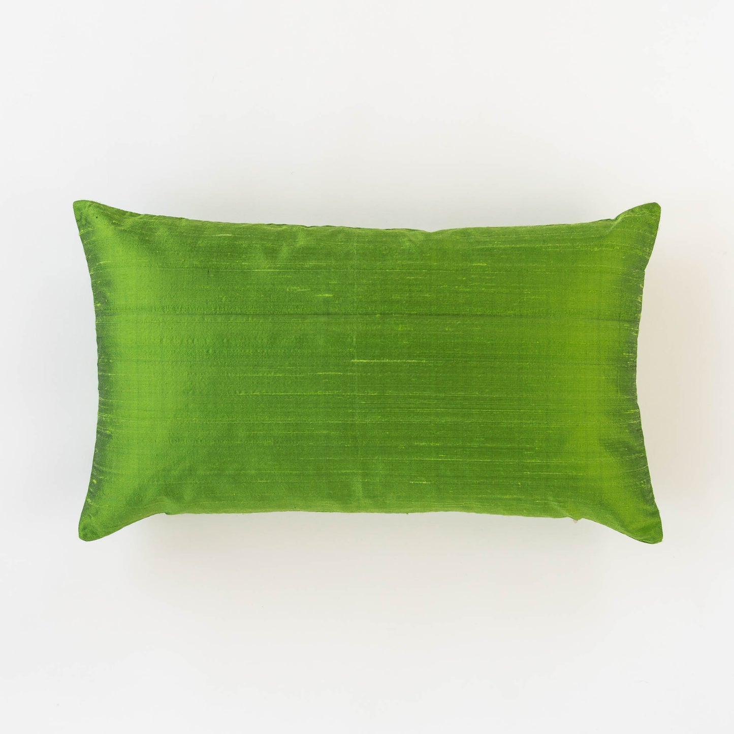 Thai dupioni silk, front and back, with cotton lining and invisible zipper. Handmade in Maine and Vermont.