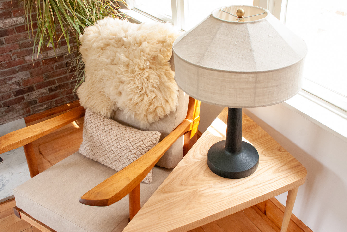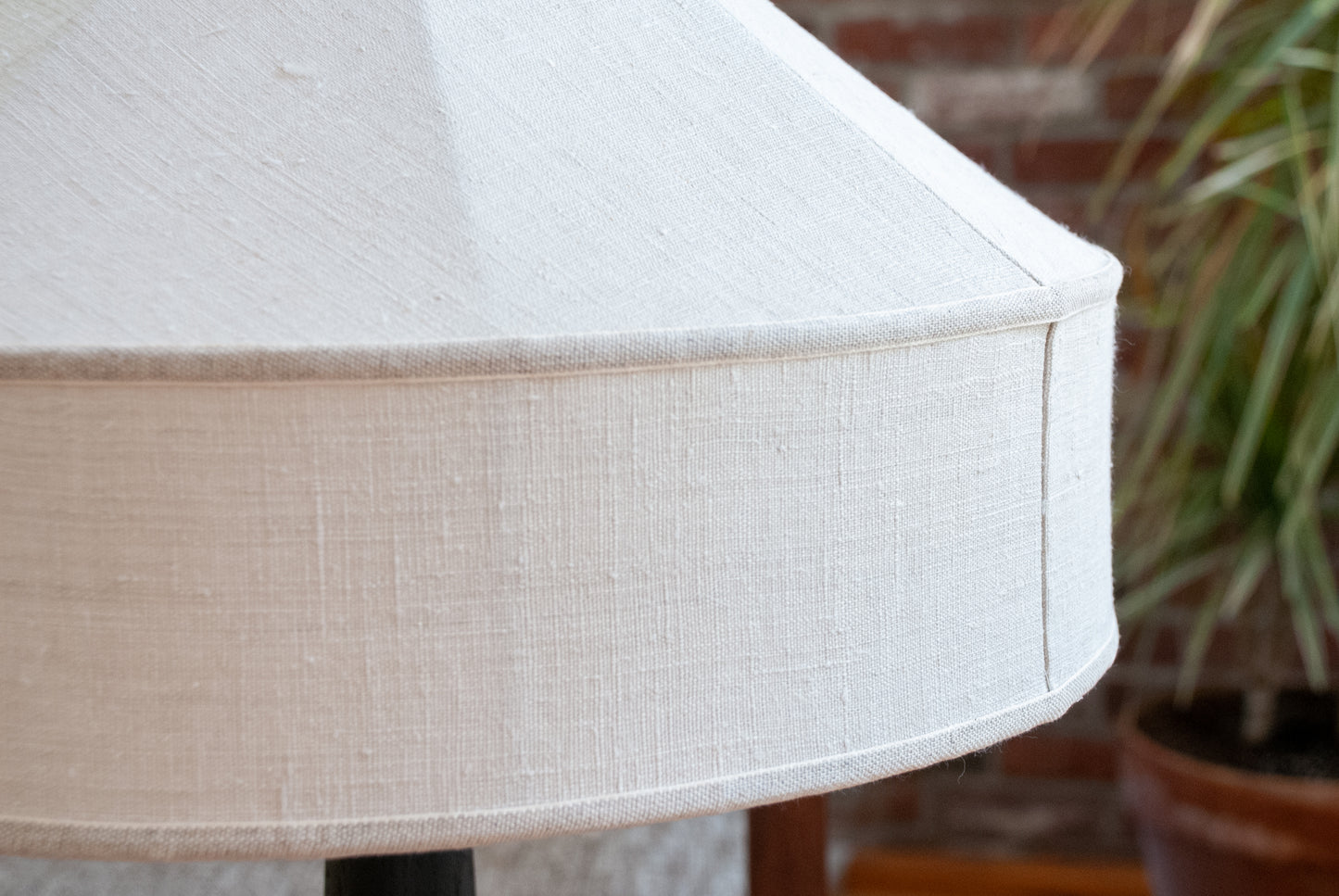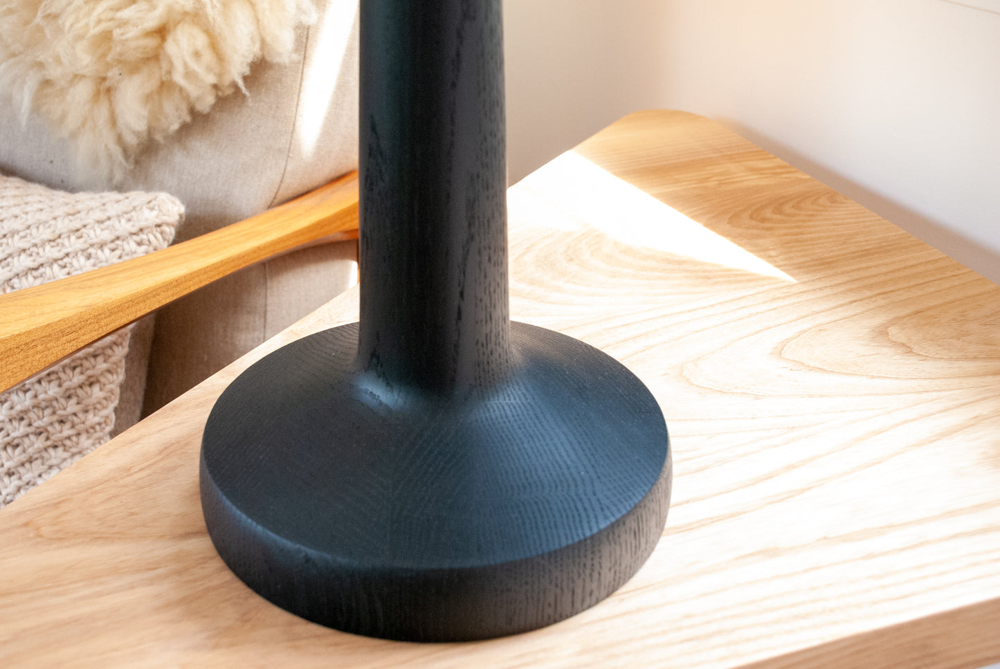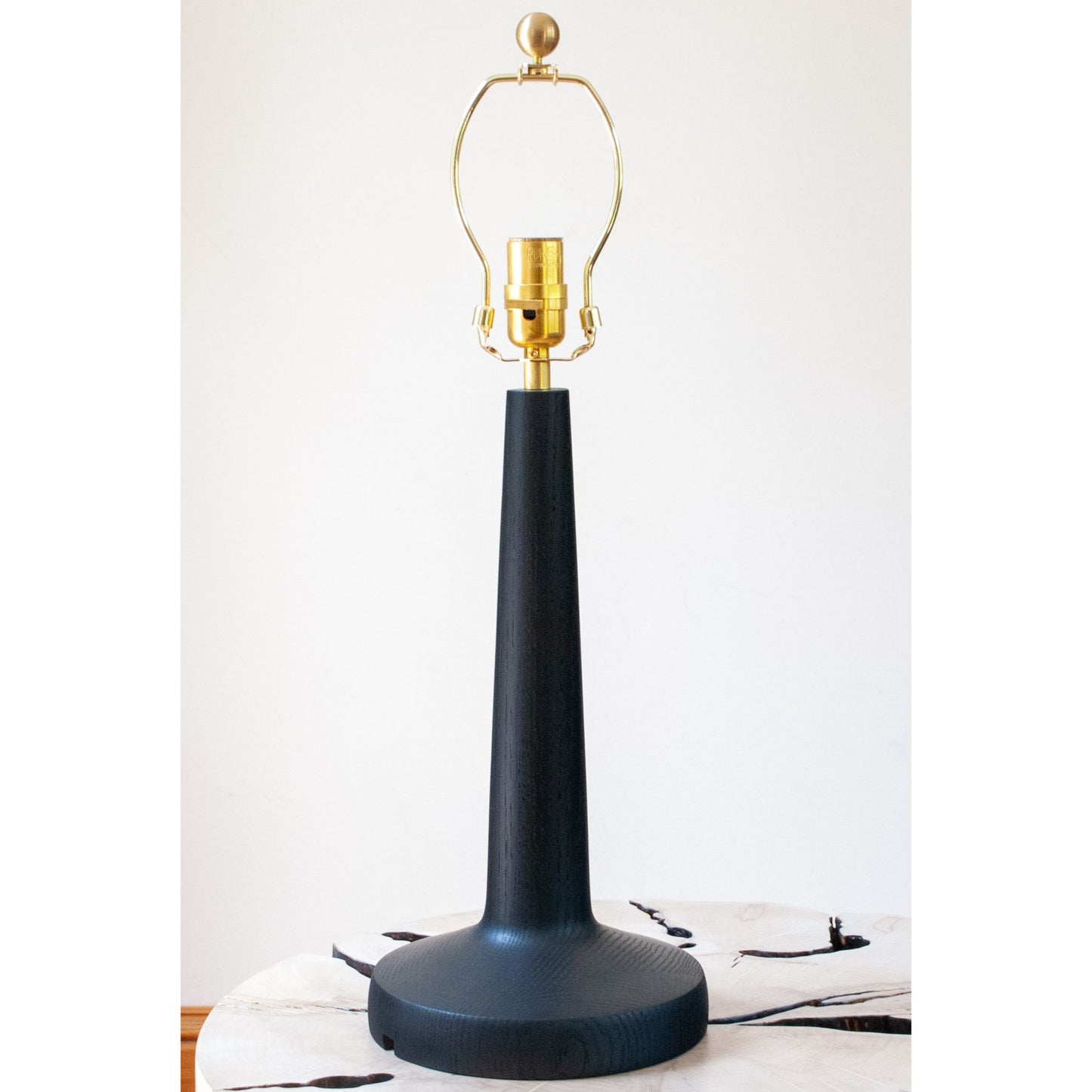 Turned solid wood lamp base with brass fixtures. Shown in ebonized red oak with natural oil and wax finish. Hand-sewn antique French linen (ca 1890) shade.
