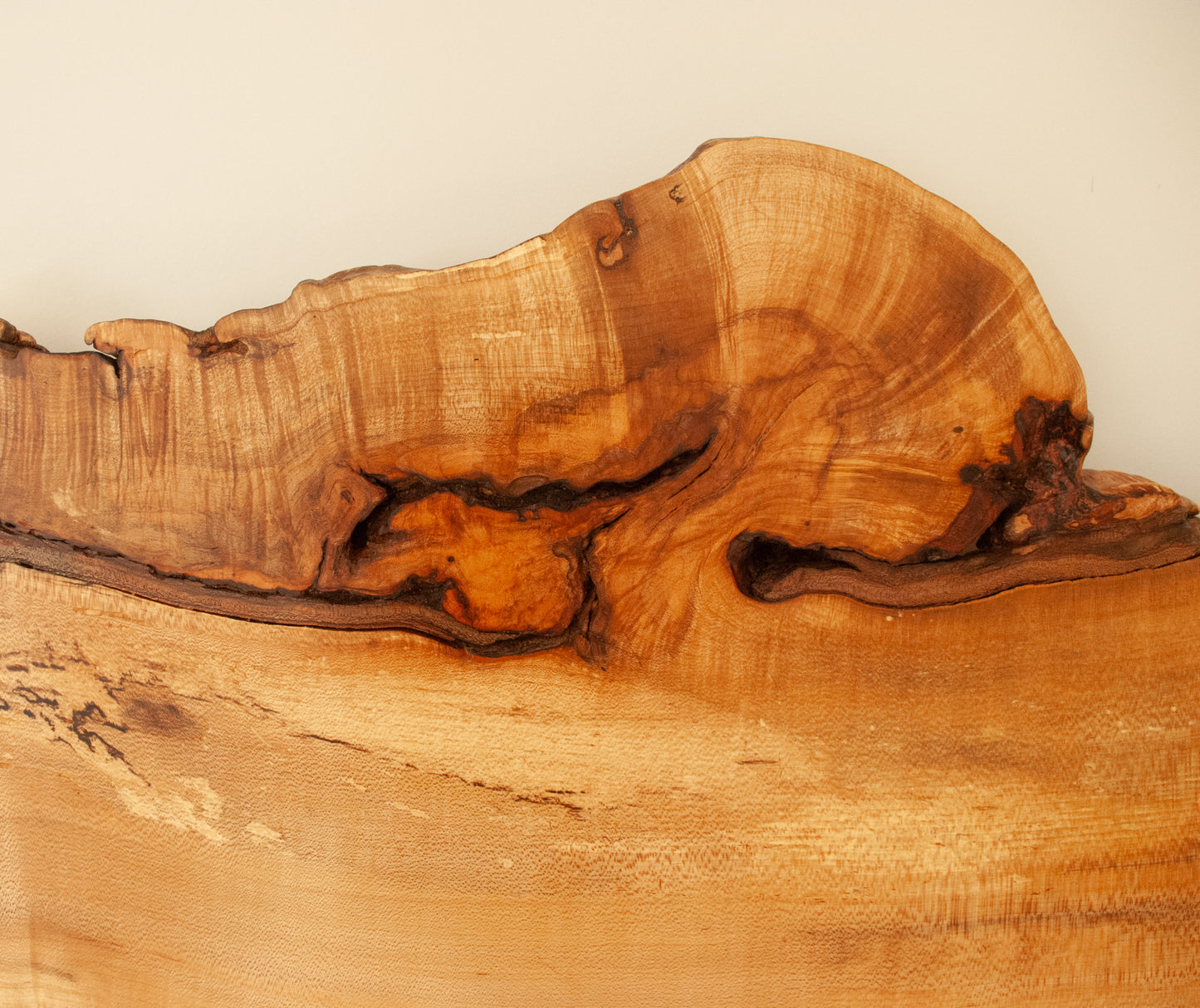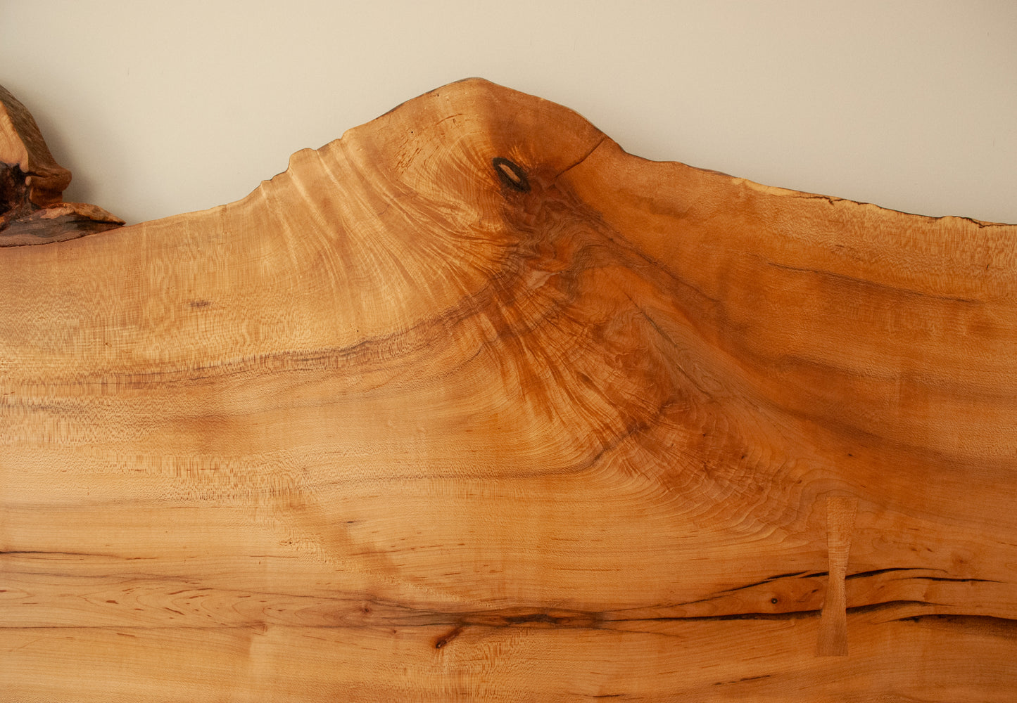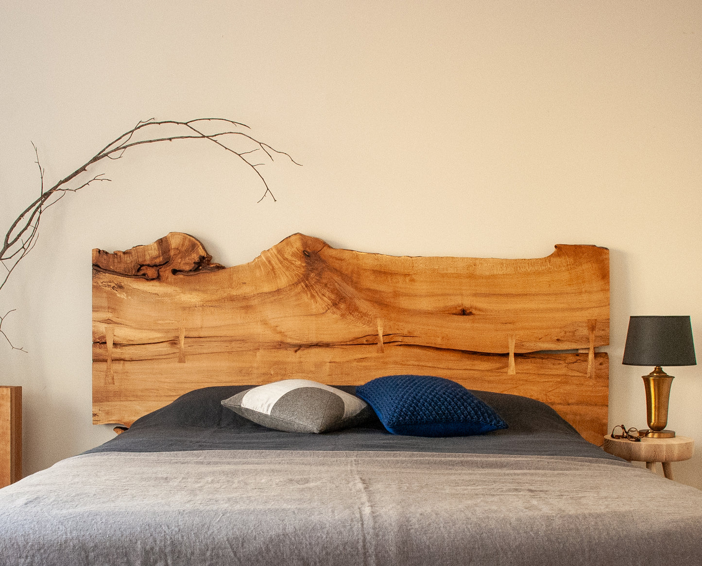 Live-edge maple slab headboard with traditional hand-cut butterfly or spline joints to stabilize cracks. Solid wood back braces are constructed to stabilize slab and provide French cleat mounting system. Each piece features the unique shape and grain of the wood used.