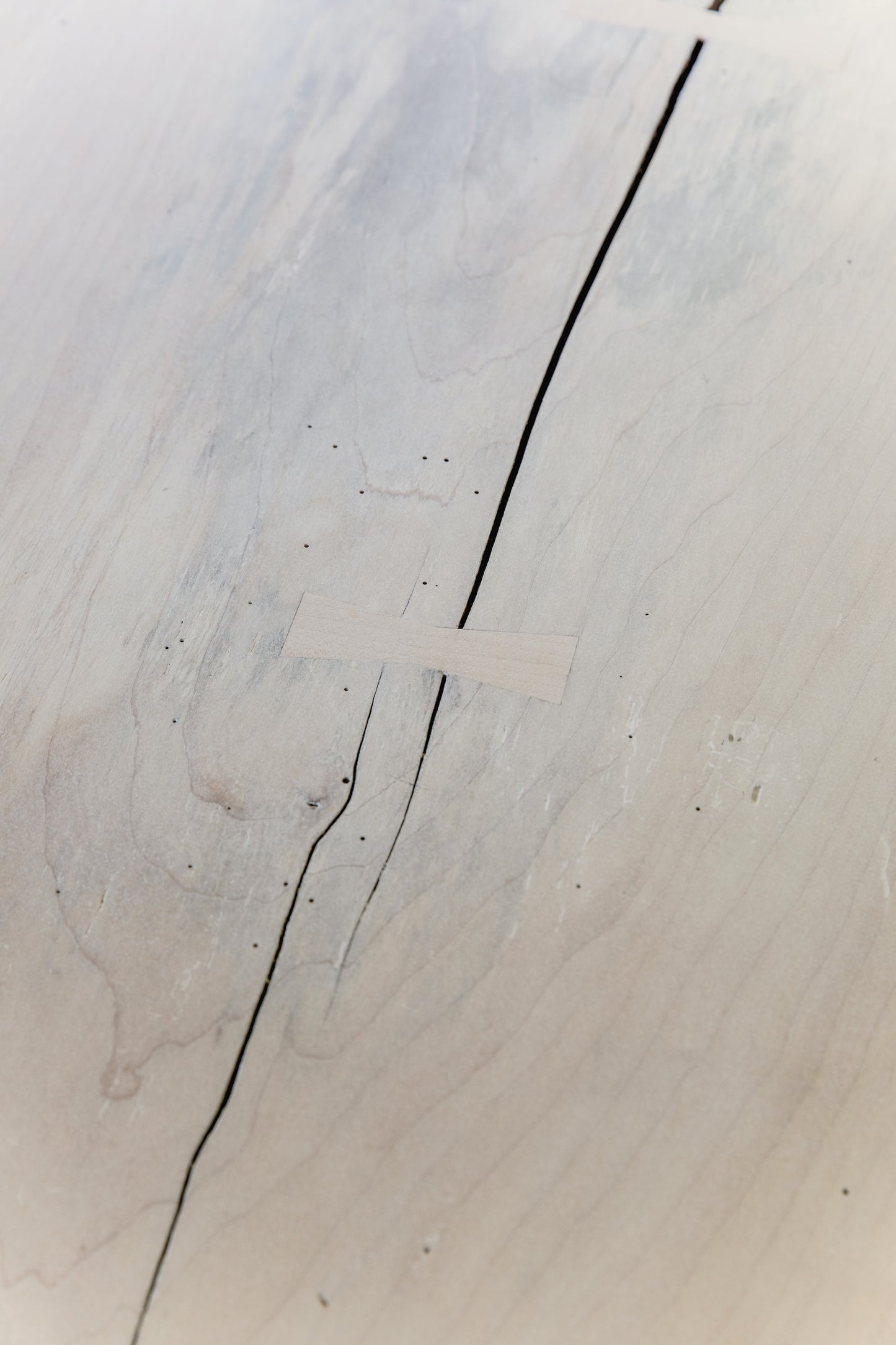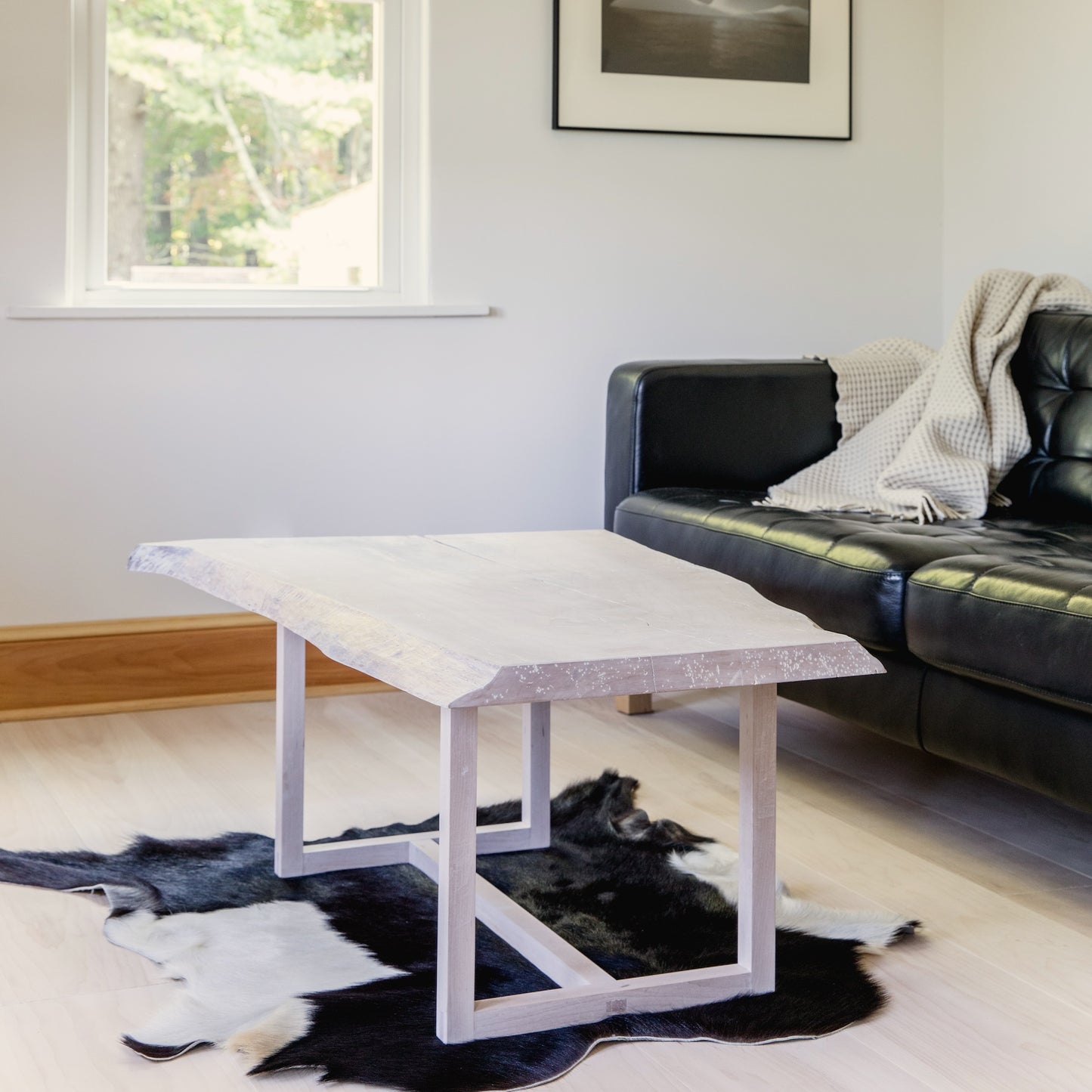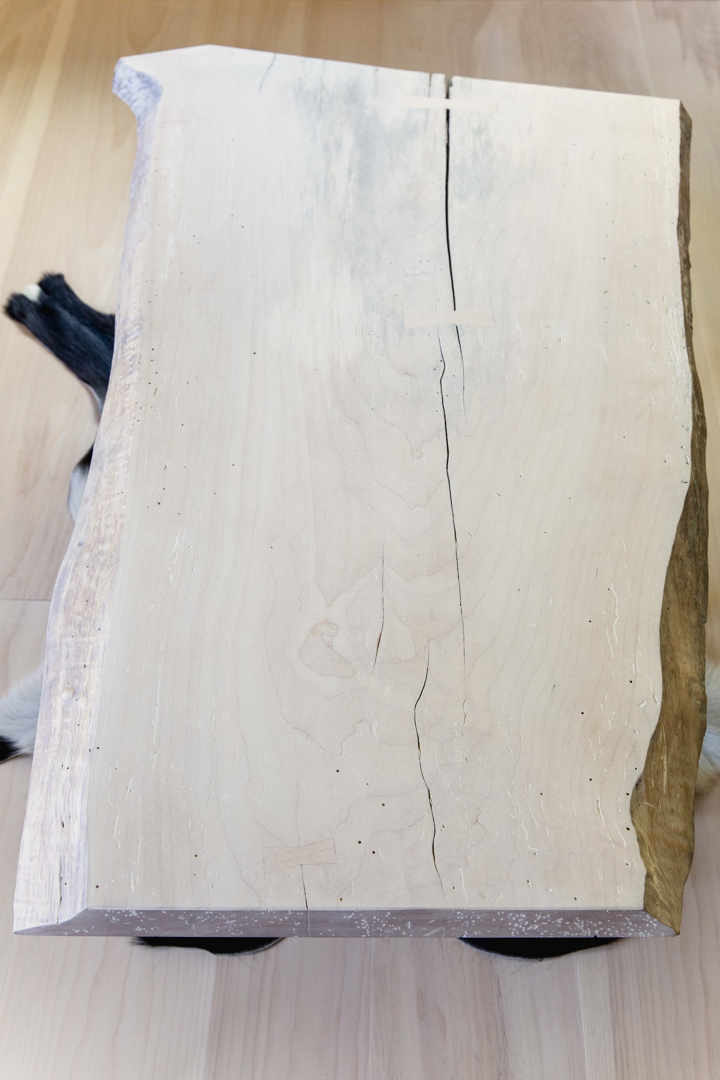 Sugar maple slab sourced from Owls Head, Maine. Hard maple base, constructed with through-wedged tenons and corner bridle joints. Bleached & hand-applied pigmented finish.