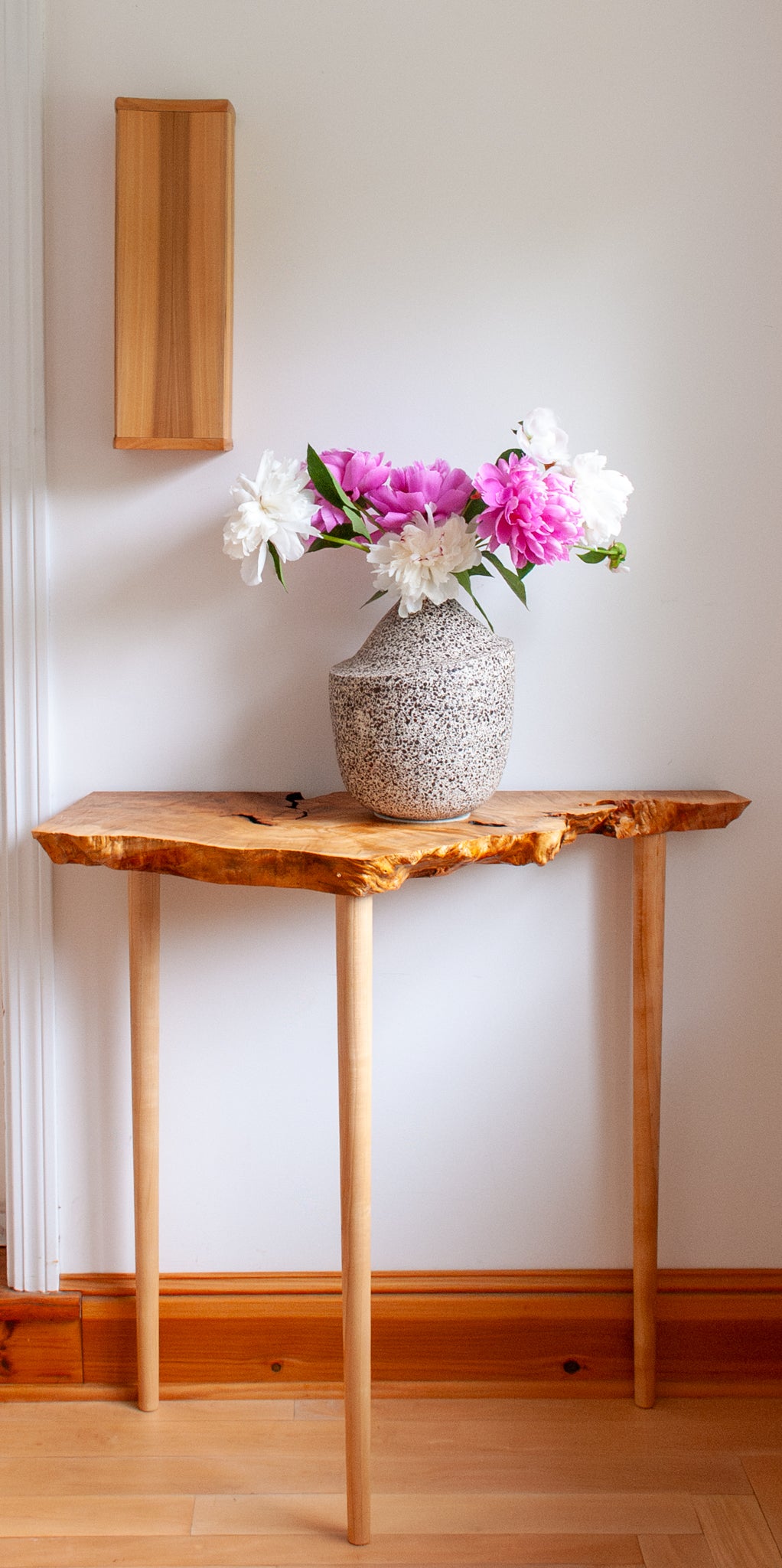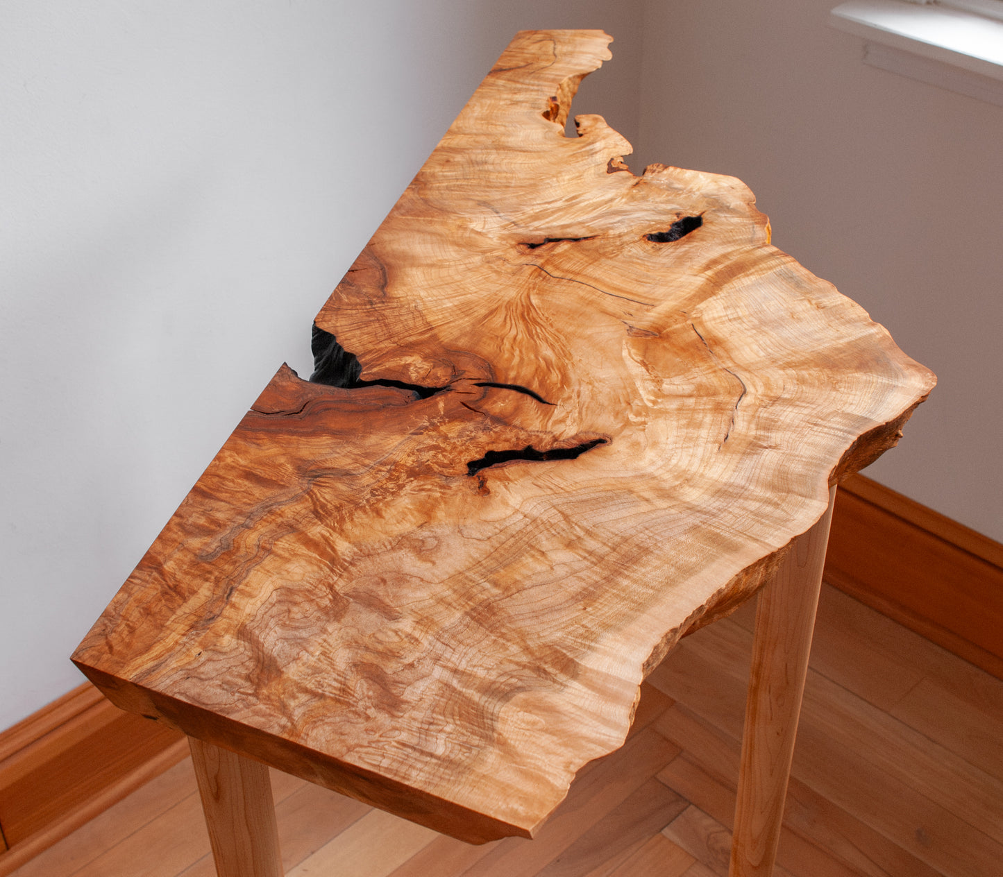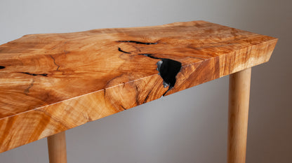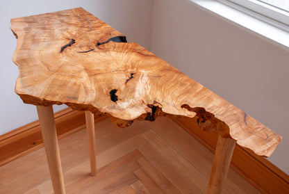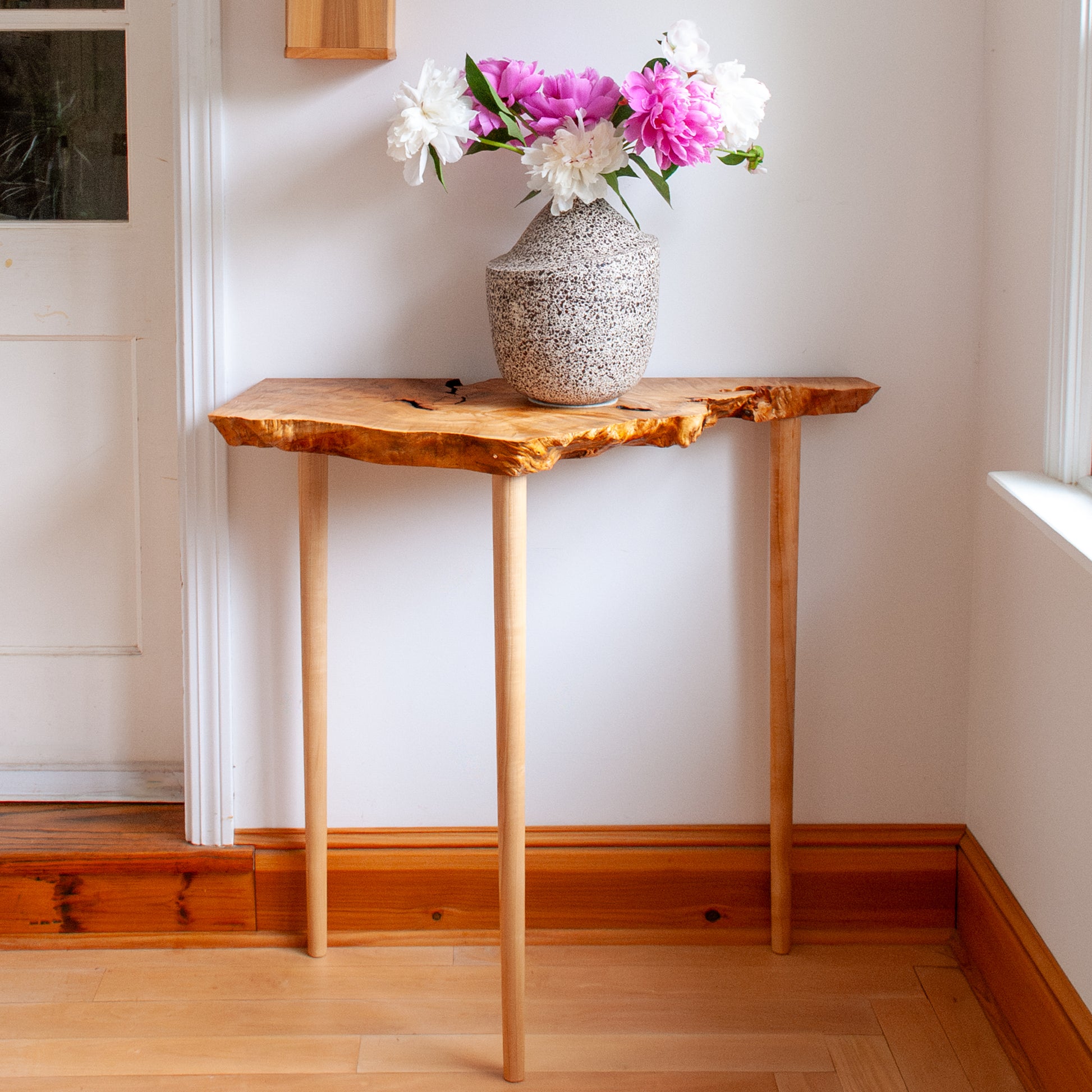 Live-edge Maine maple console table. Hand-finished with natural oil and wax.