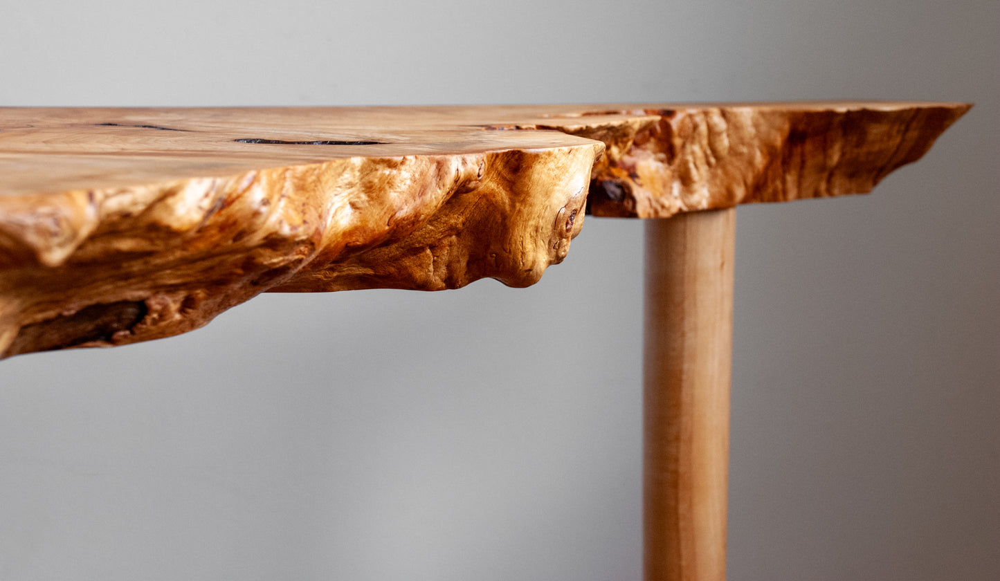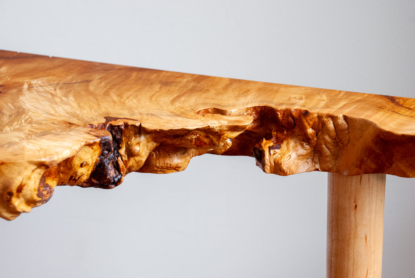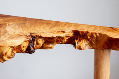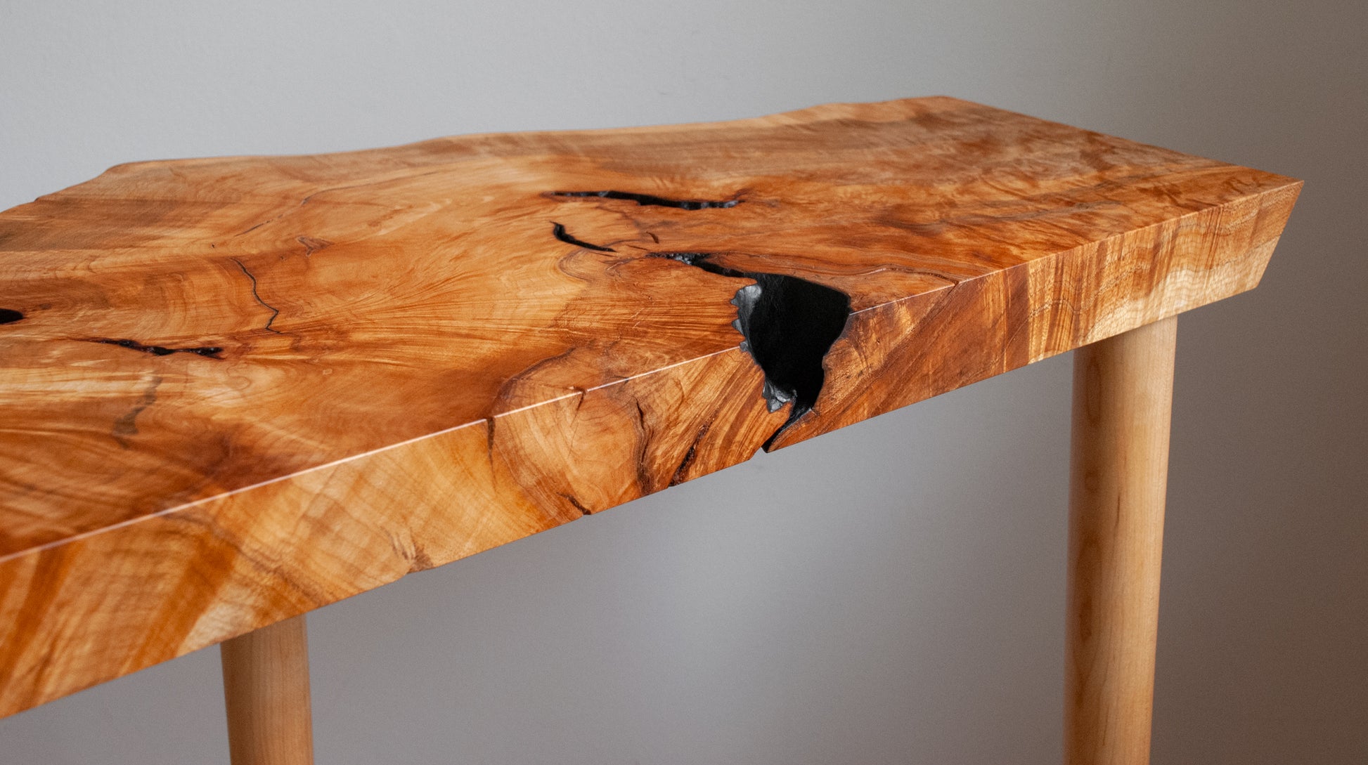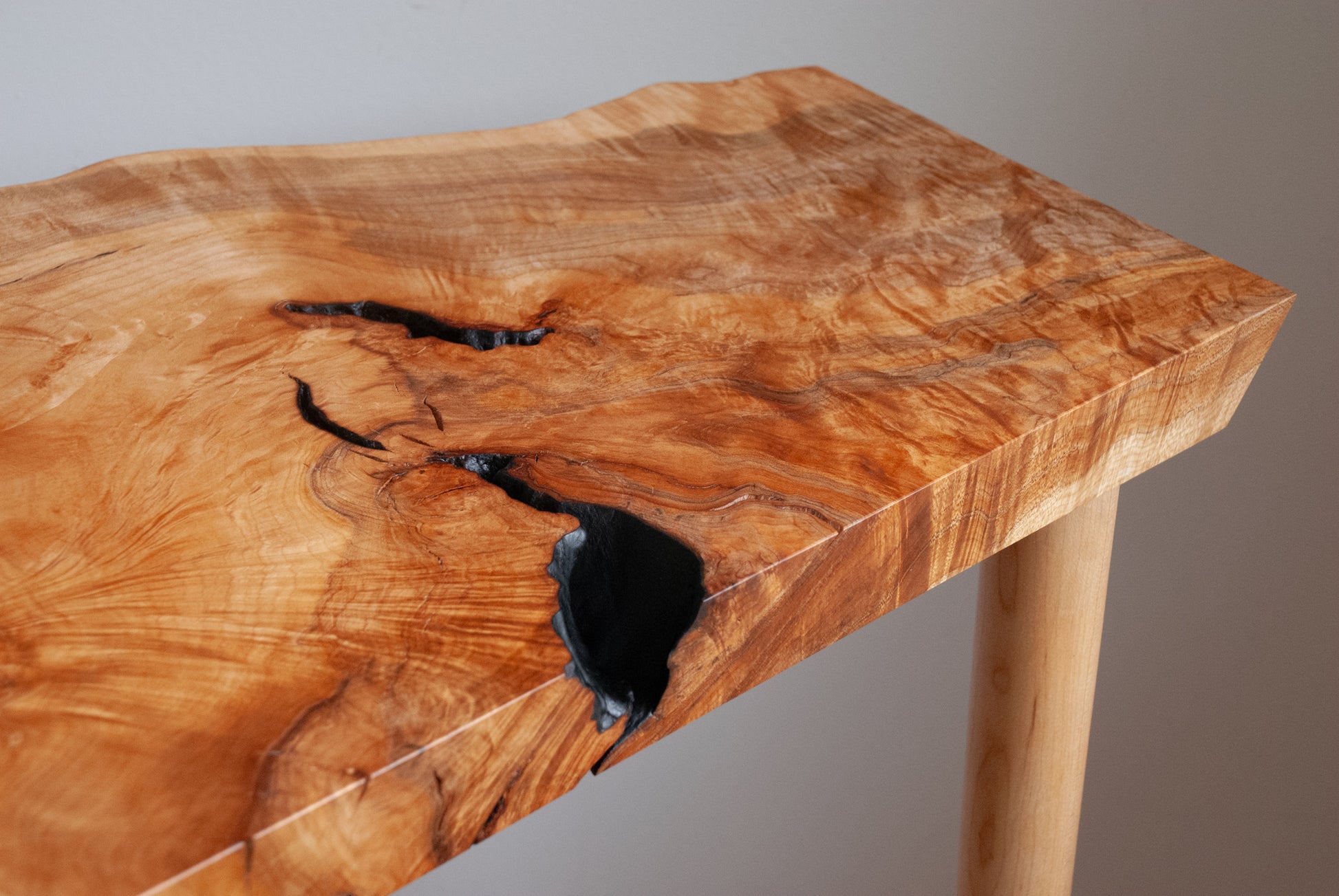 Live-edge Maine maple console table. Hand-finished with natural oil and wax.