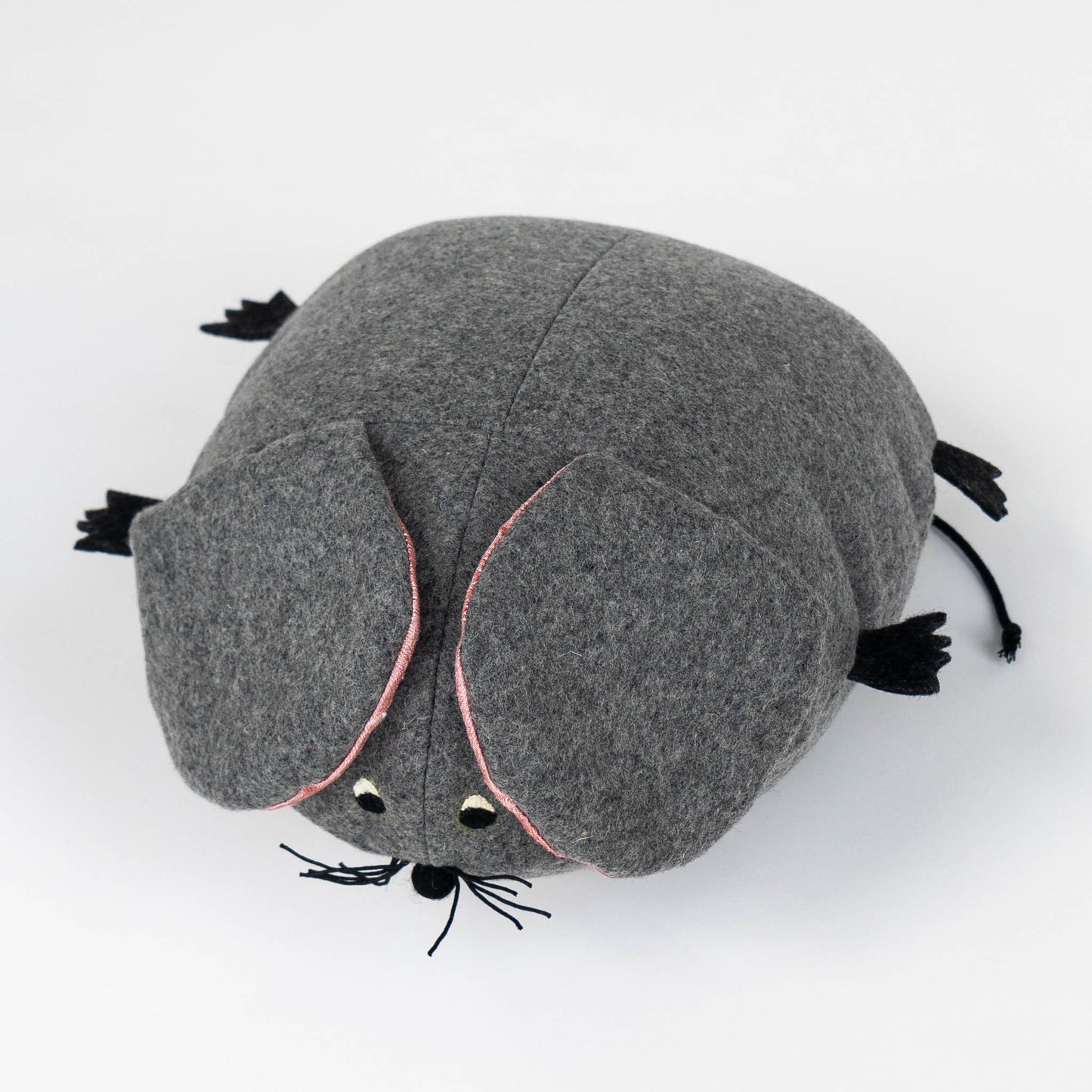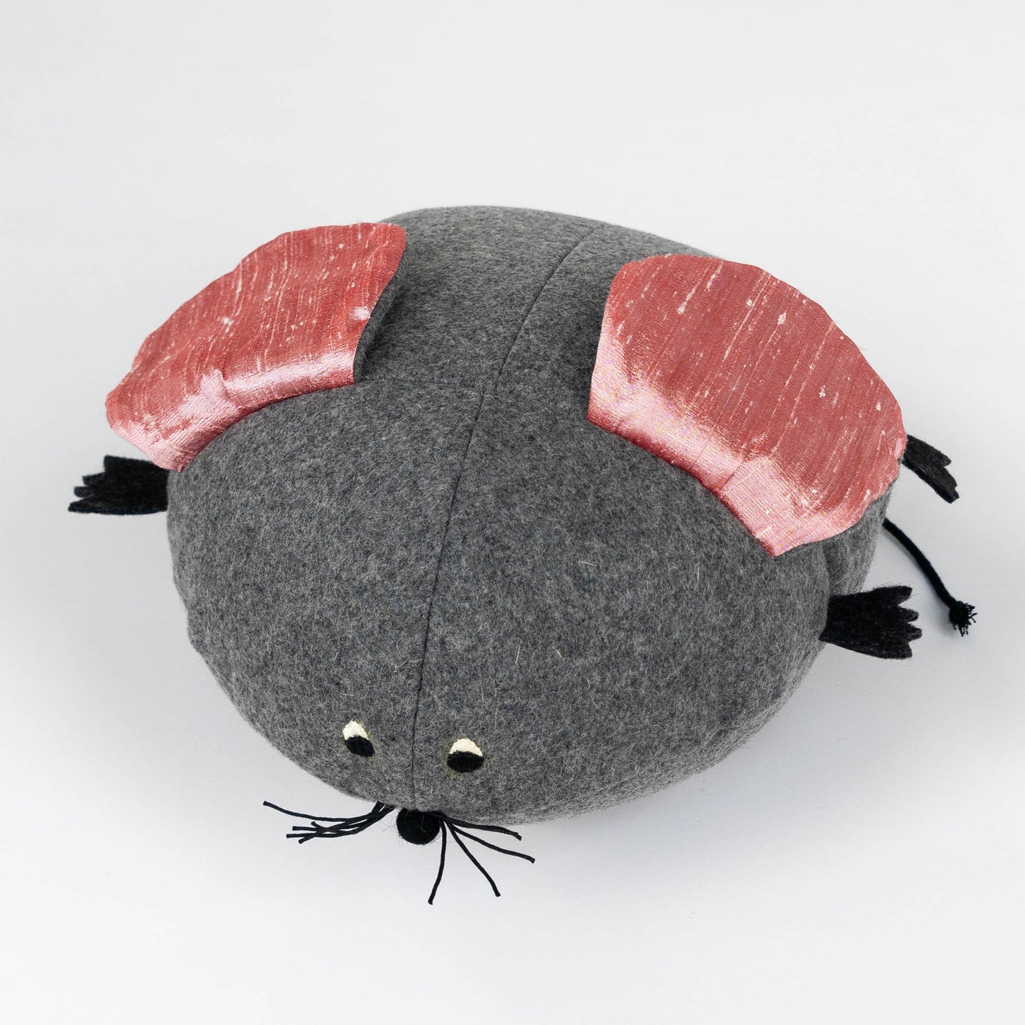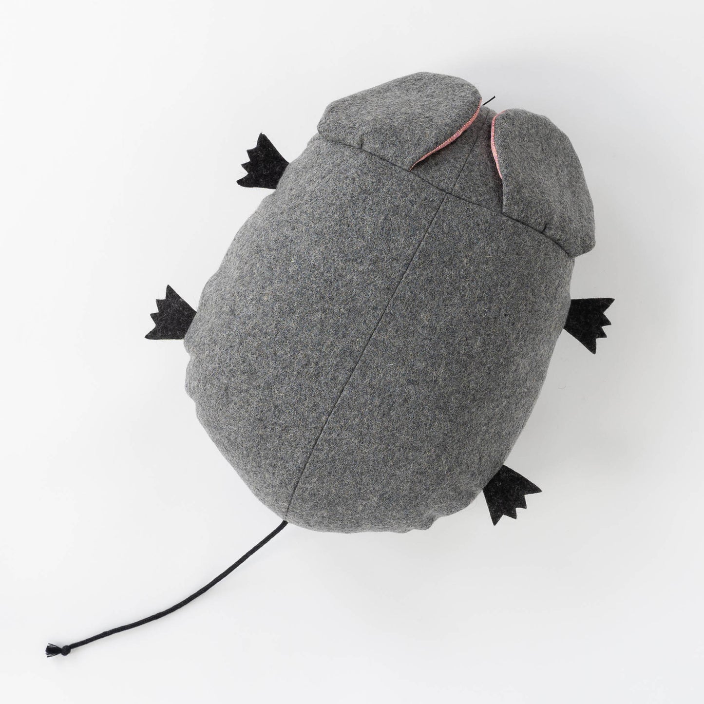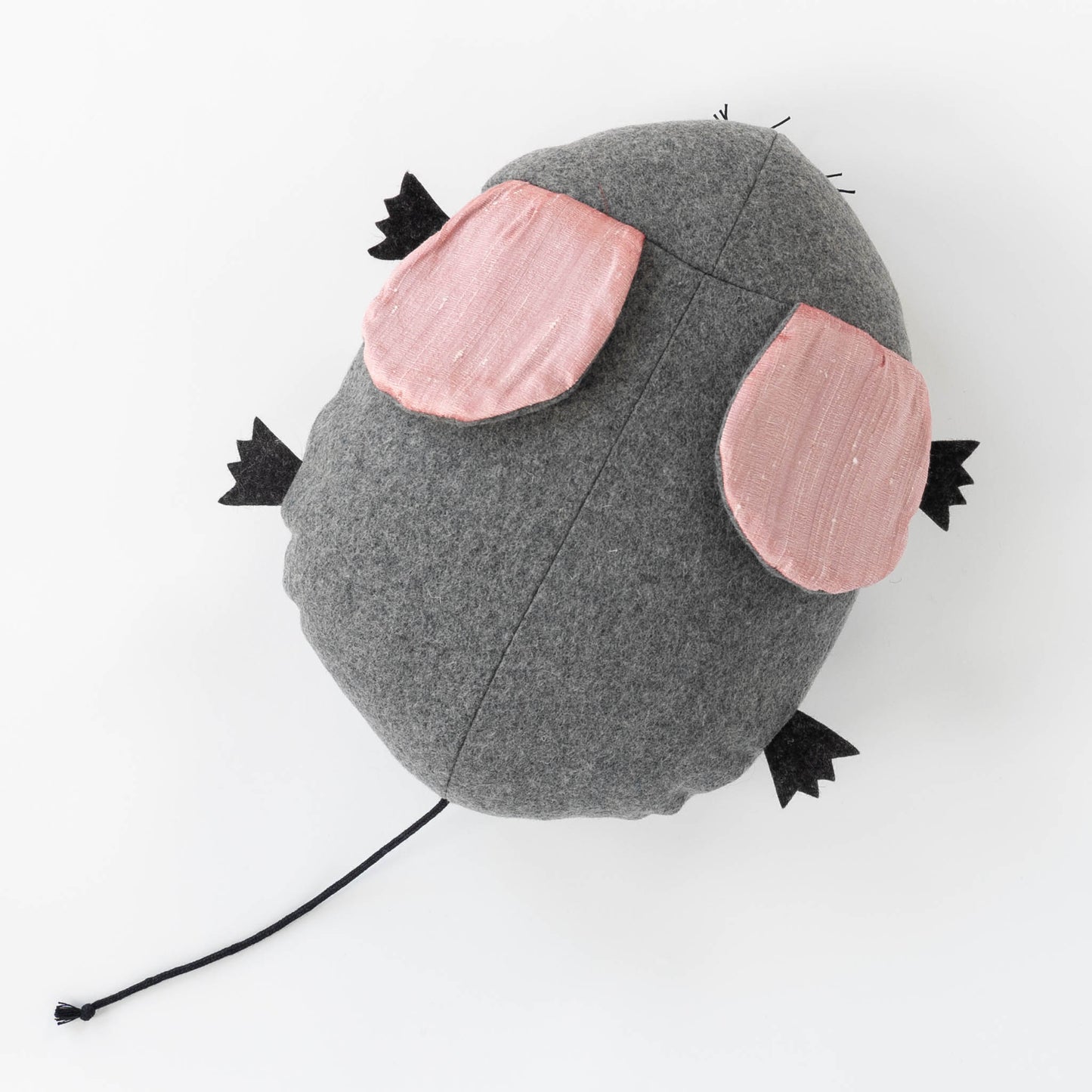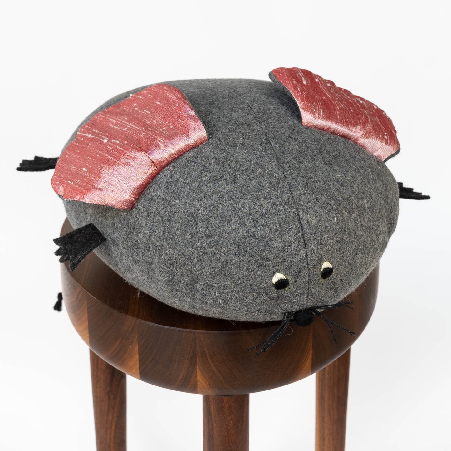 New England worsted wool, Thai dupioni silk, wool felt, hand-embroidered details, poly fill. Handmade in Maine and Vermont.