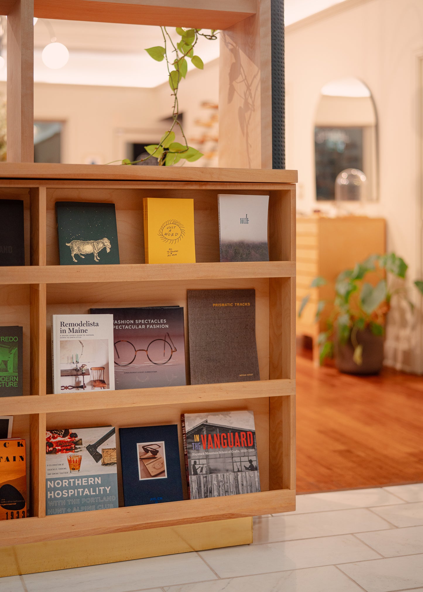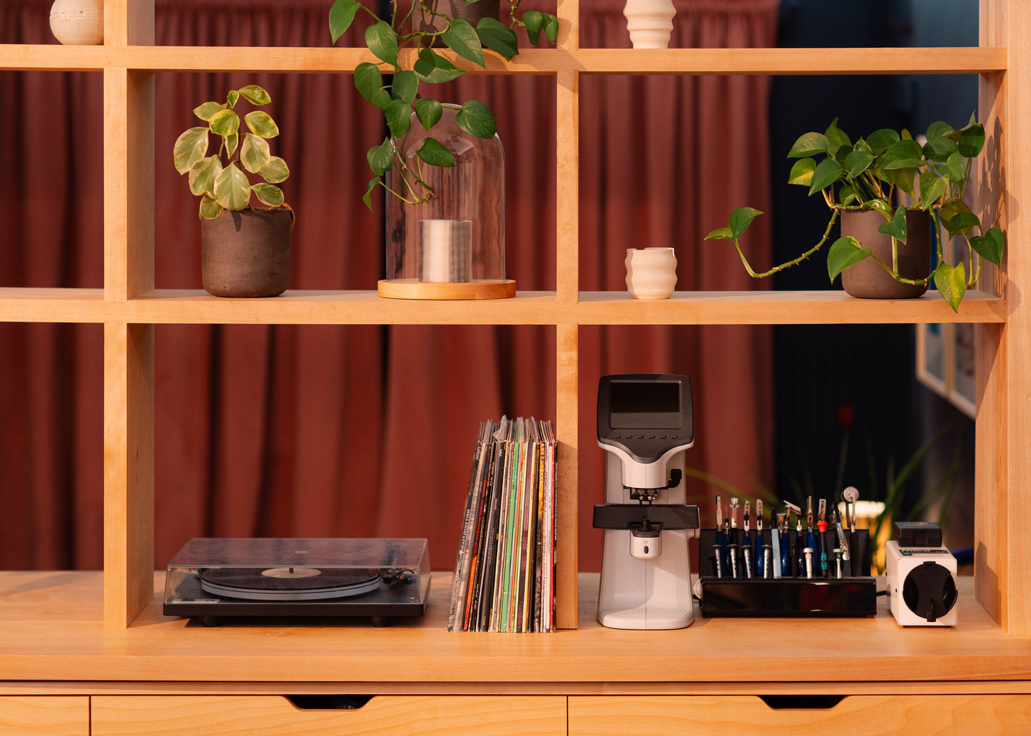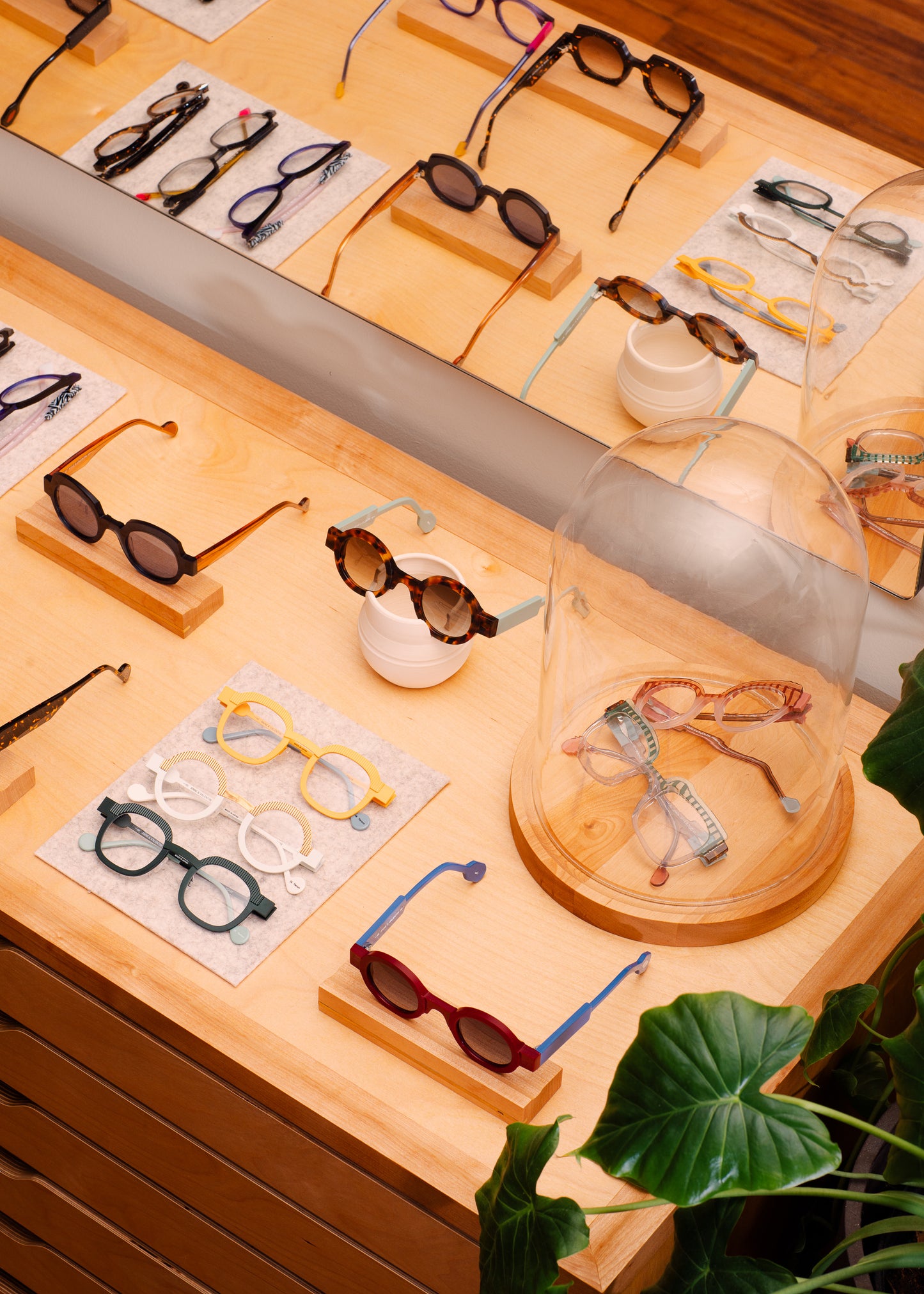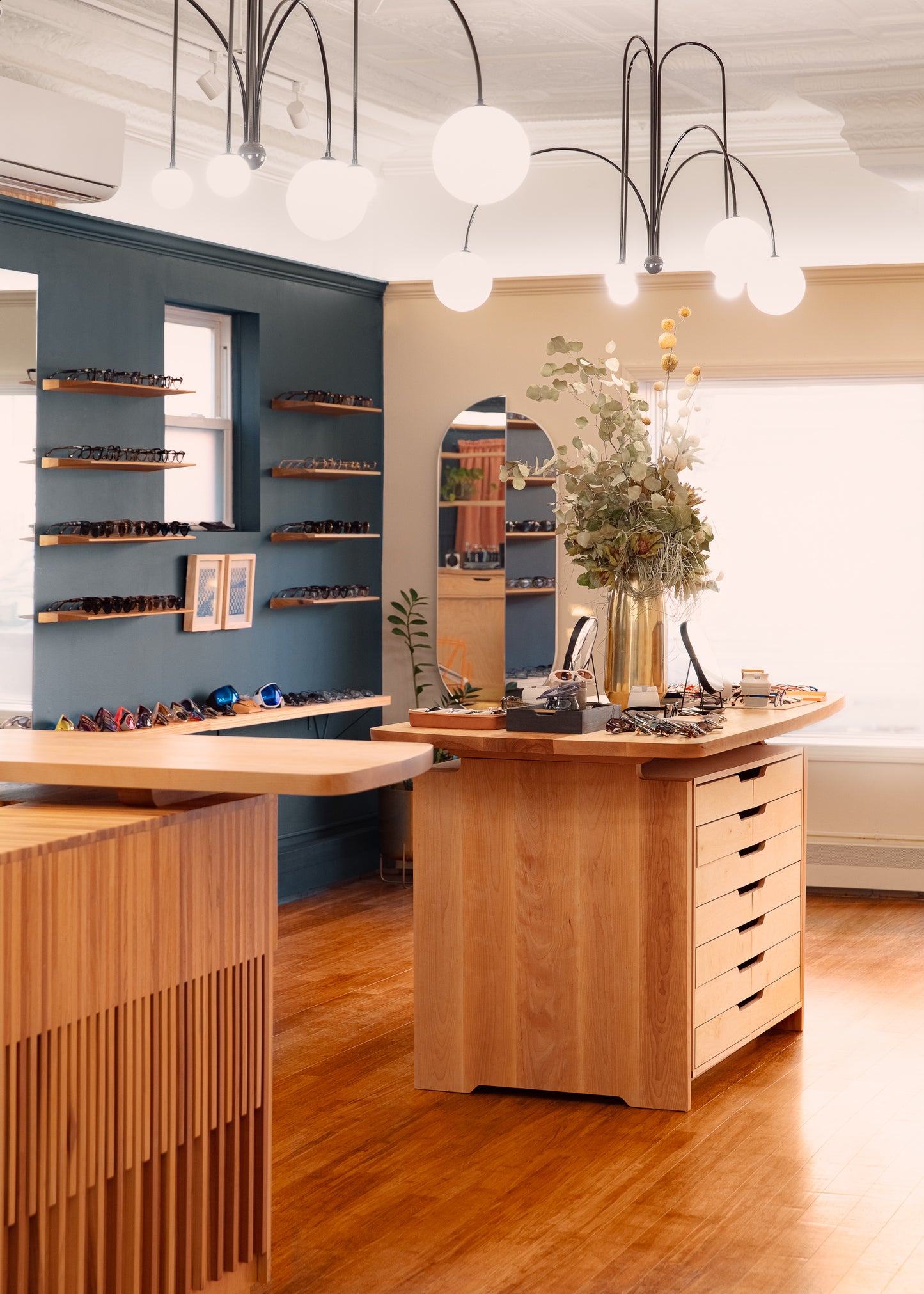 Optician's custom-designed cabinets with soft-close drawers fit with hand-made dividers and wool felt liners. One-of-a-kind table tops, room divider shelves, and book rack designs built of solid birch and finished with oil and wax. Table top accessories built of solid birch and brass inlay.
