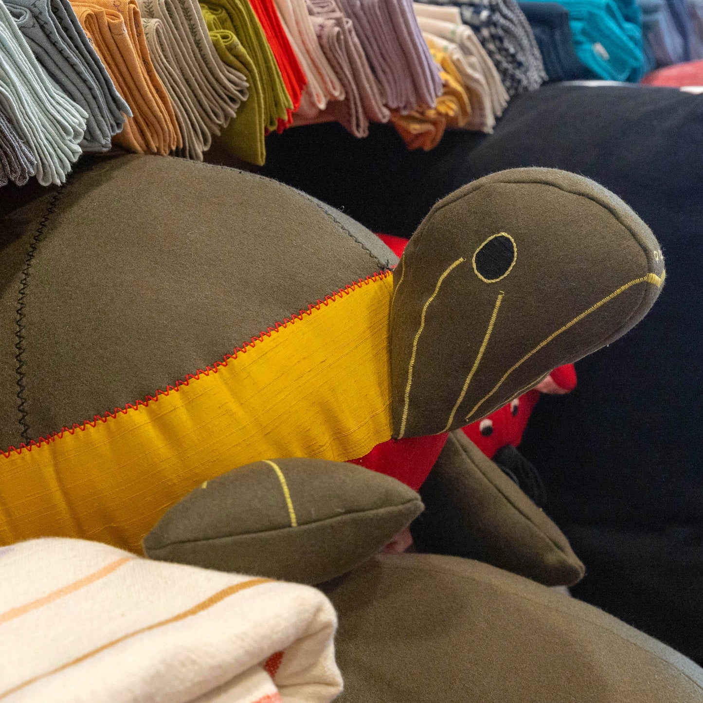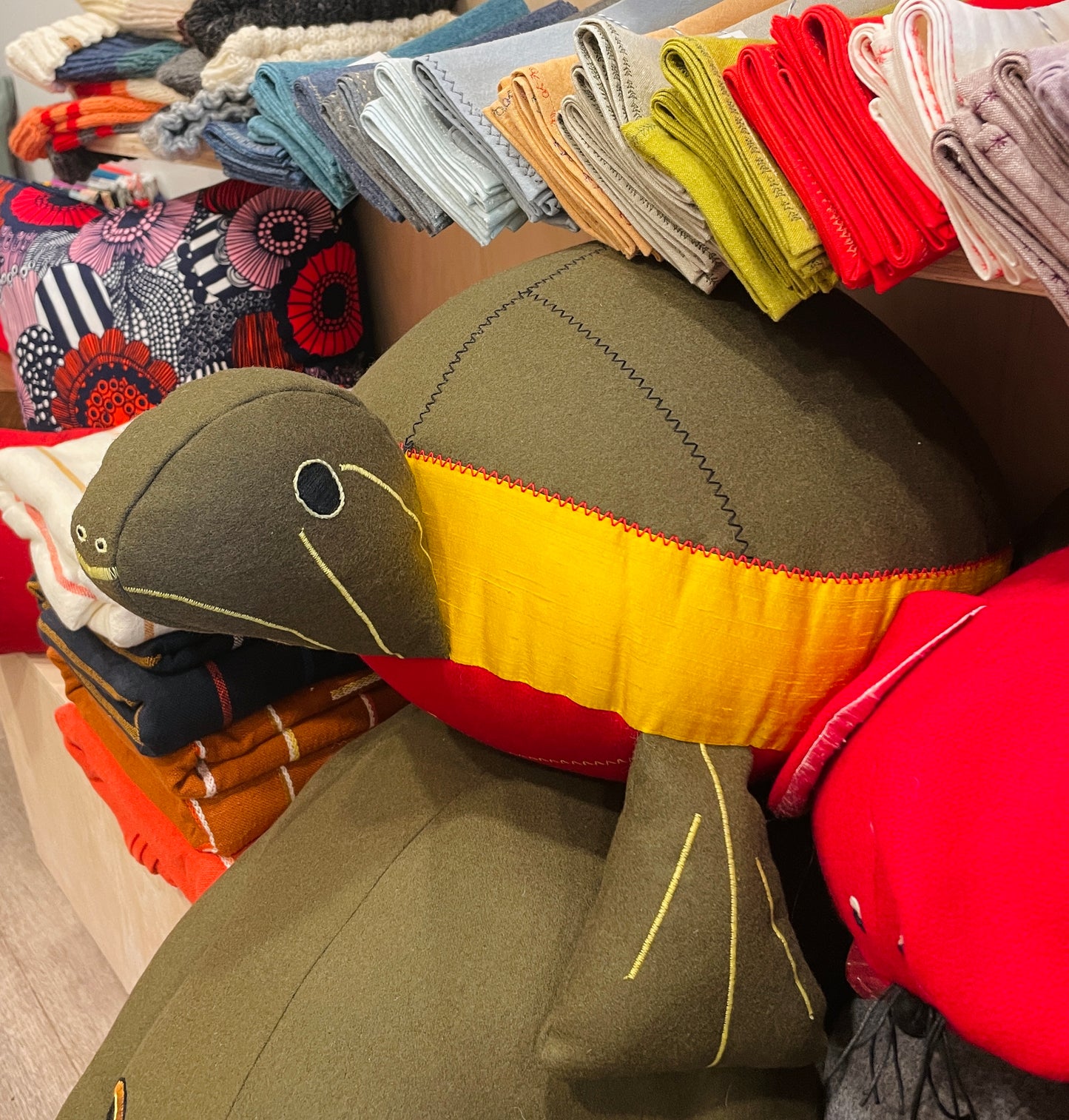 New England worsted wool, Thai dupioni silk, hand-embroidered details, poly fill. Handmade in Maine and Vermont.