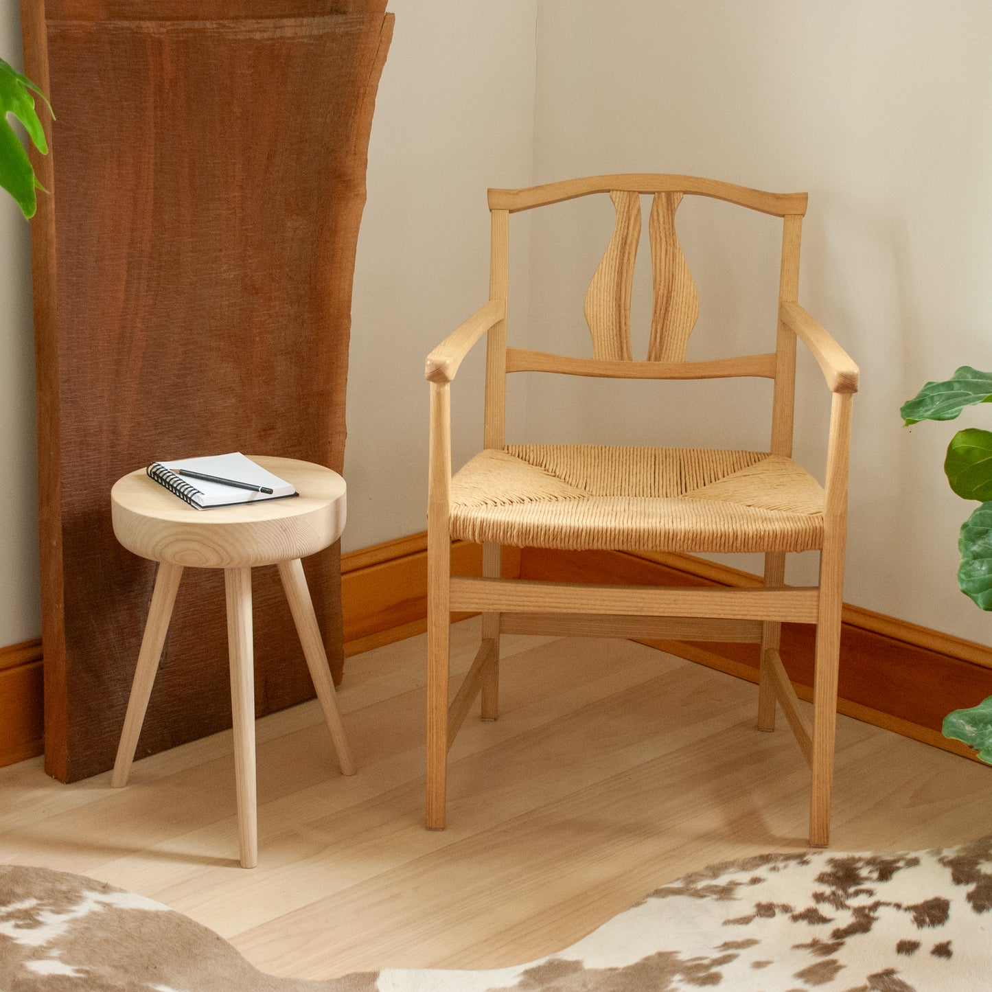 Turned, tapered legs joined with traditional tenons to a shaped 2.5”-thick solid wood top hand-finished with natural oil & wax. Pictured in natural ash.