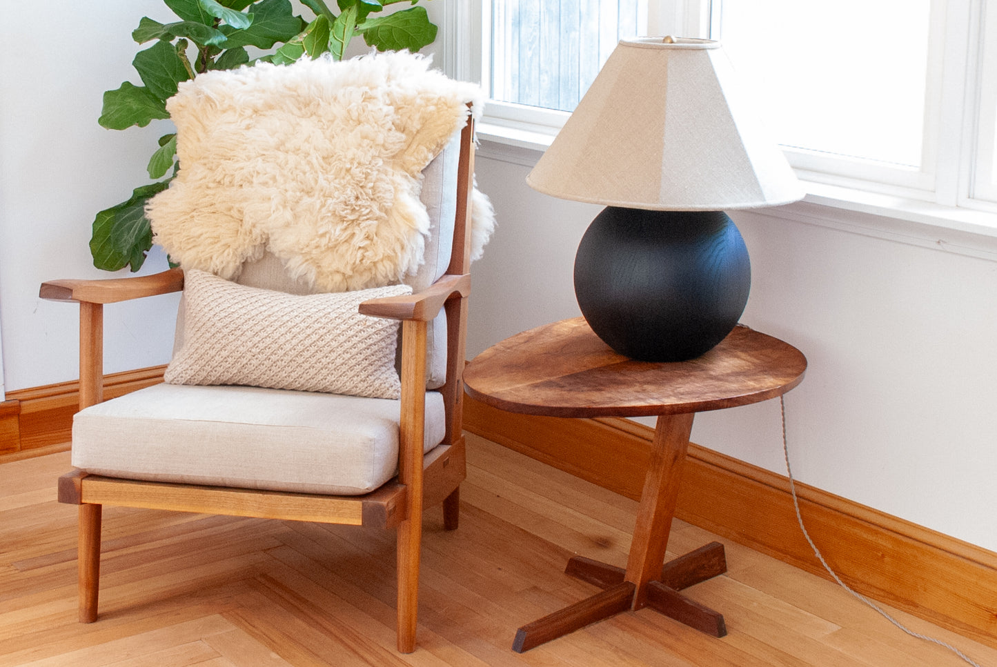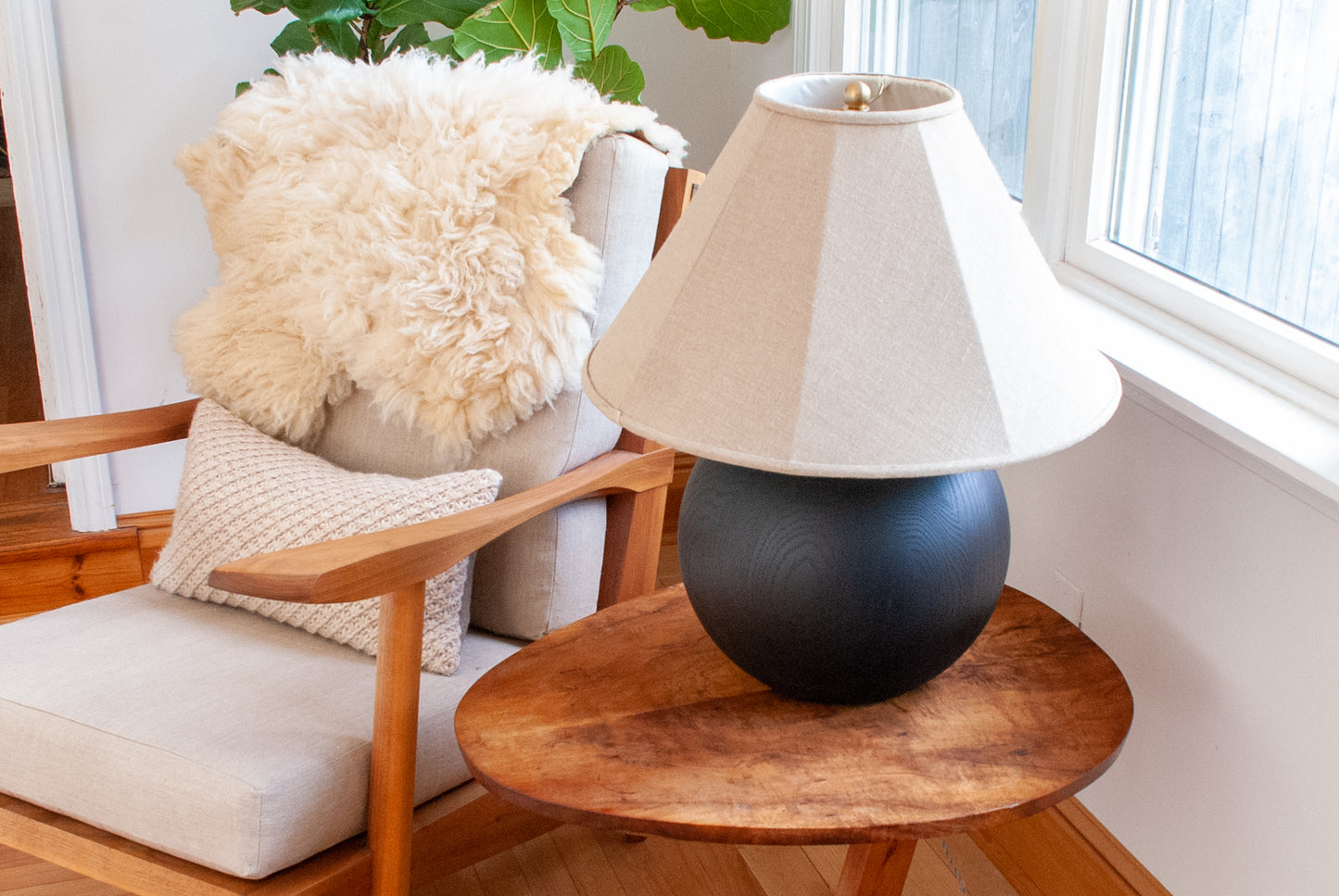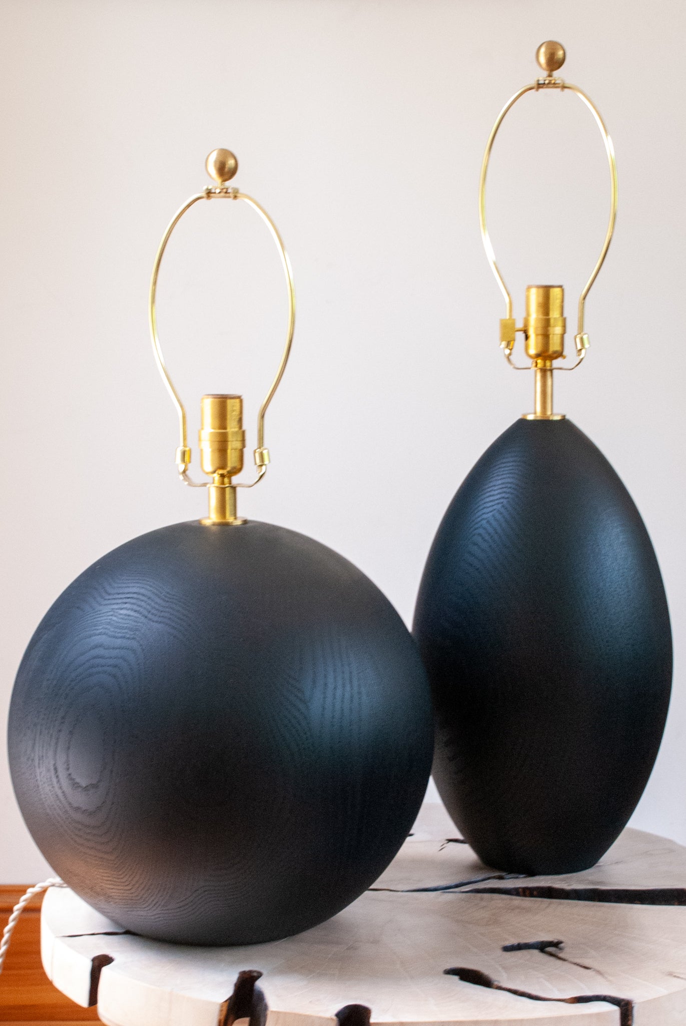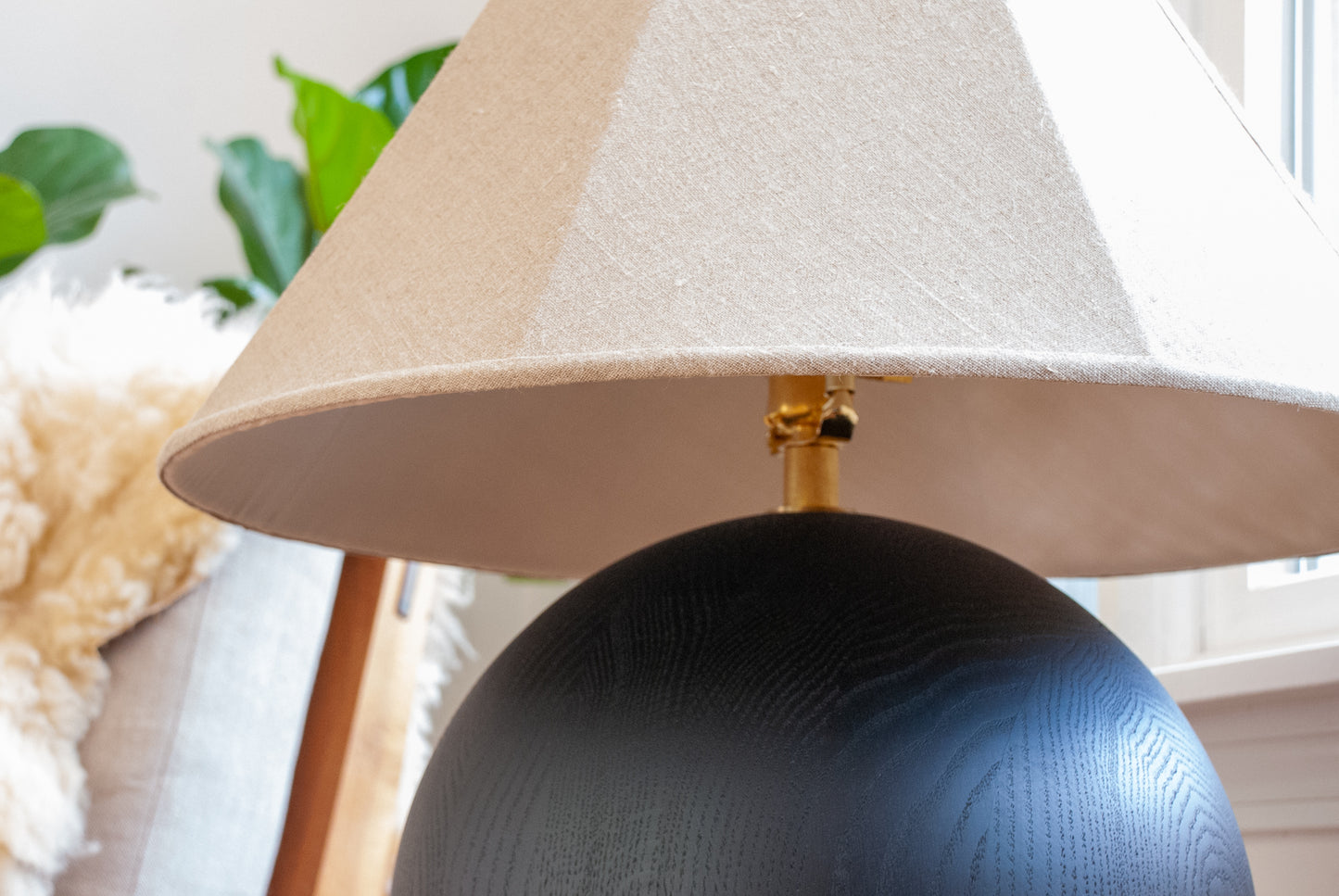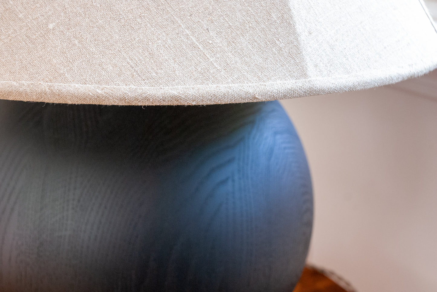 Turned solid wood lamp base with brass fixtures. Shown in ebonized red oak with natural oil and wax finish. Hand-sewn antique French linen (ca 1890) shade.