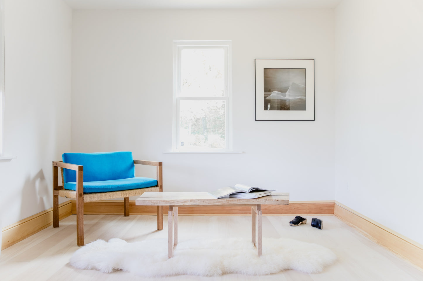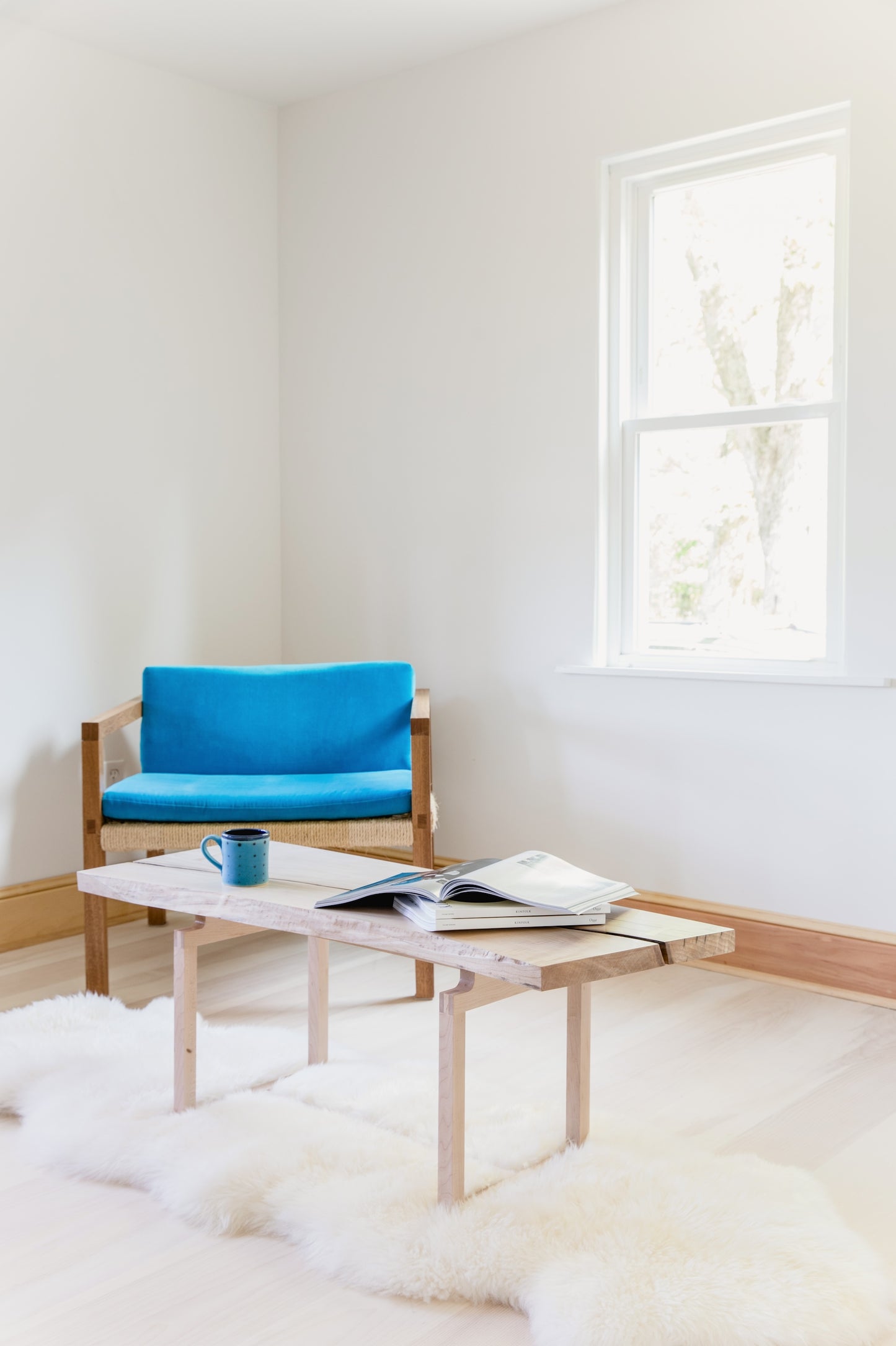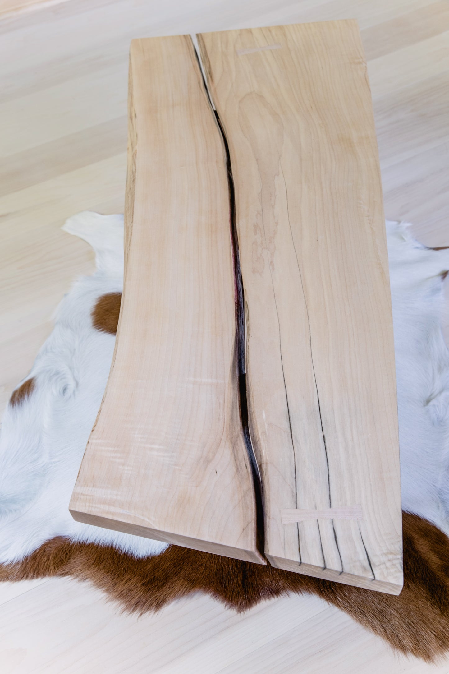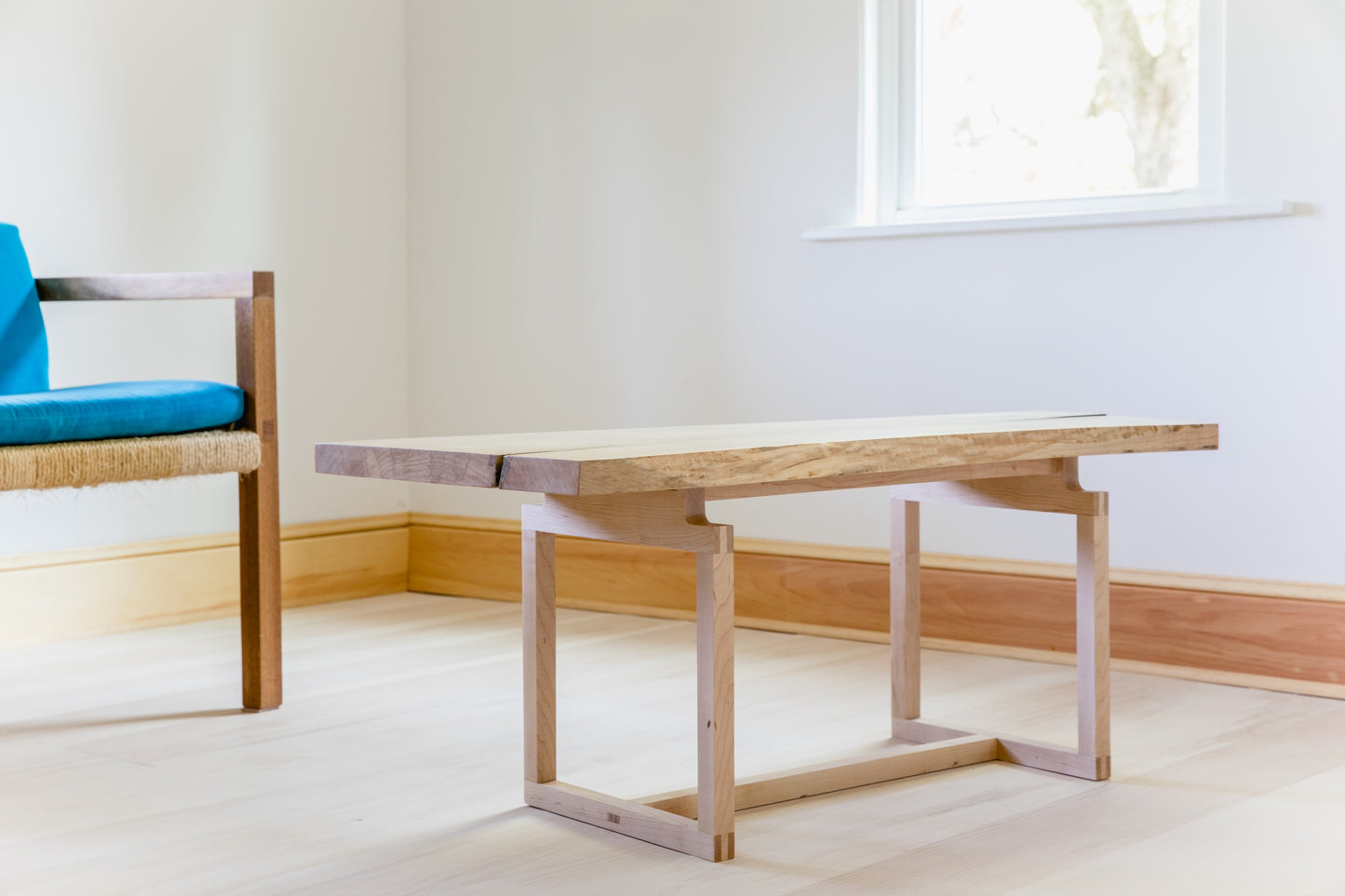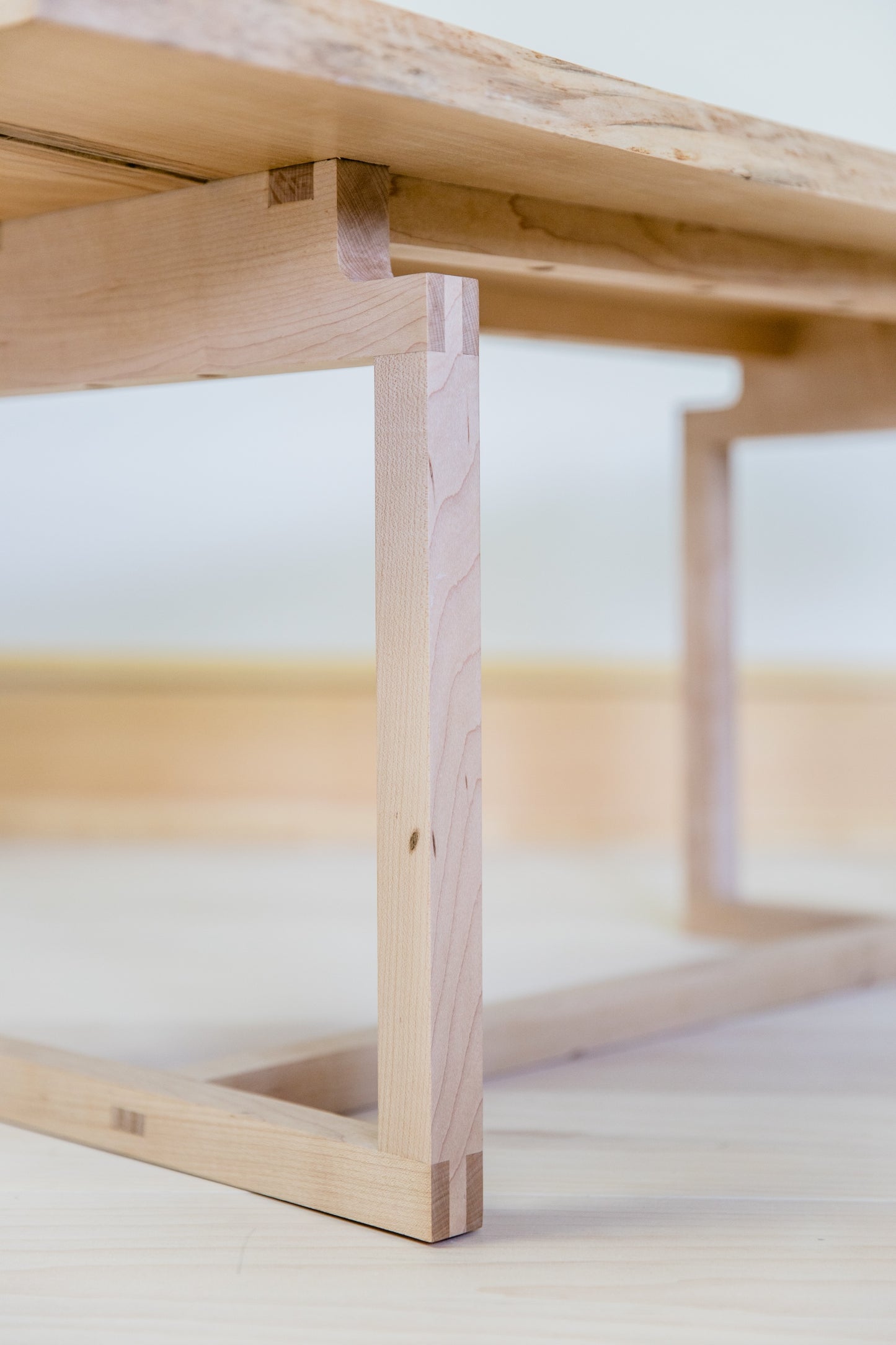 Custom live-edge coffee table with a floating table top, mortised and wedged through-tenons, bridle joints. Maple finished with natural shellac.