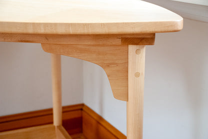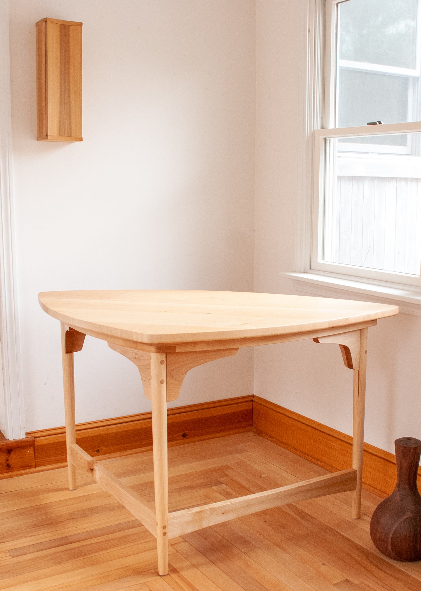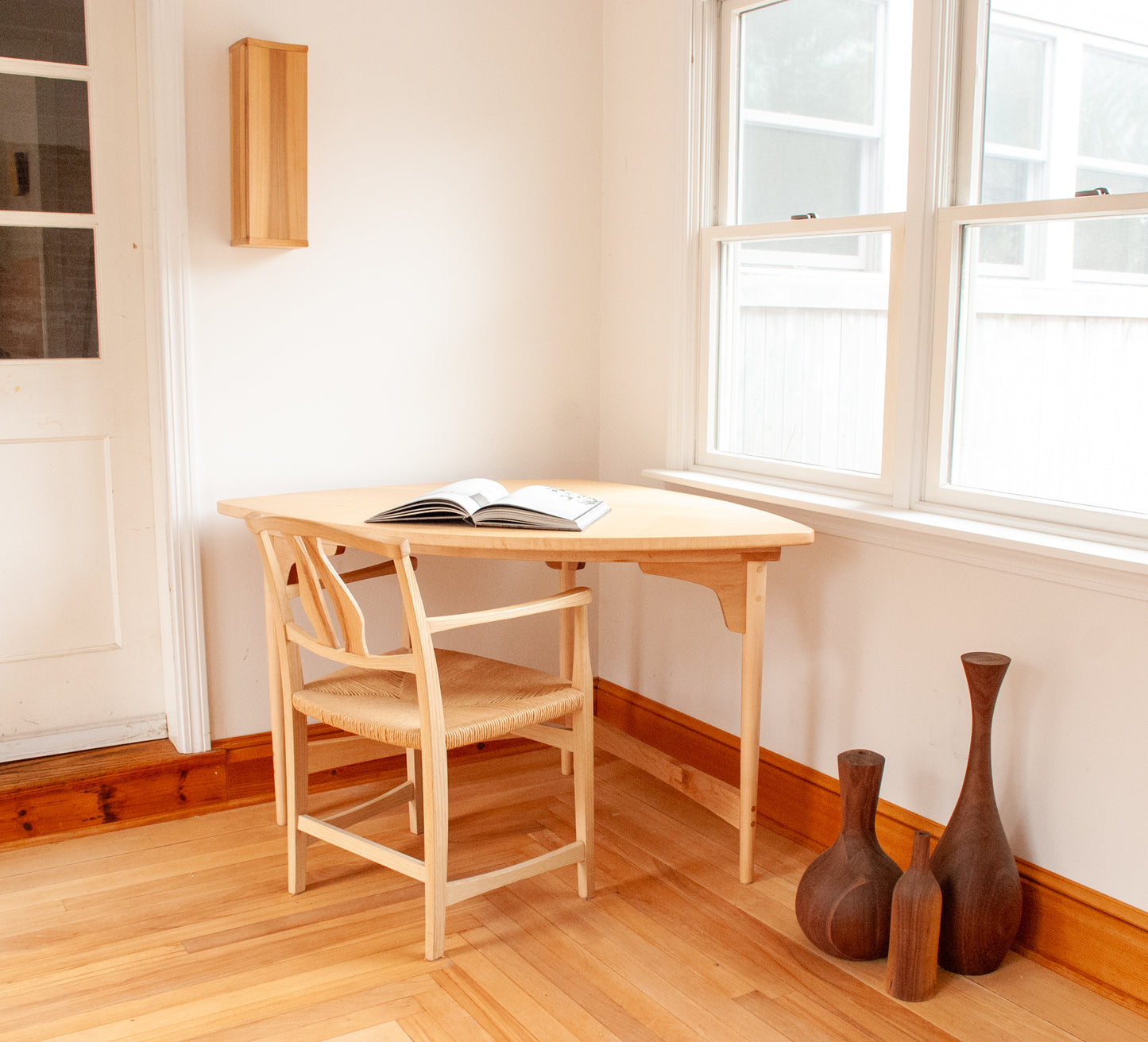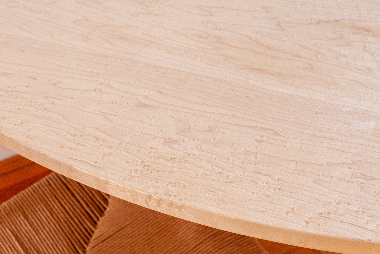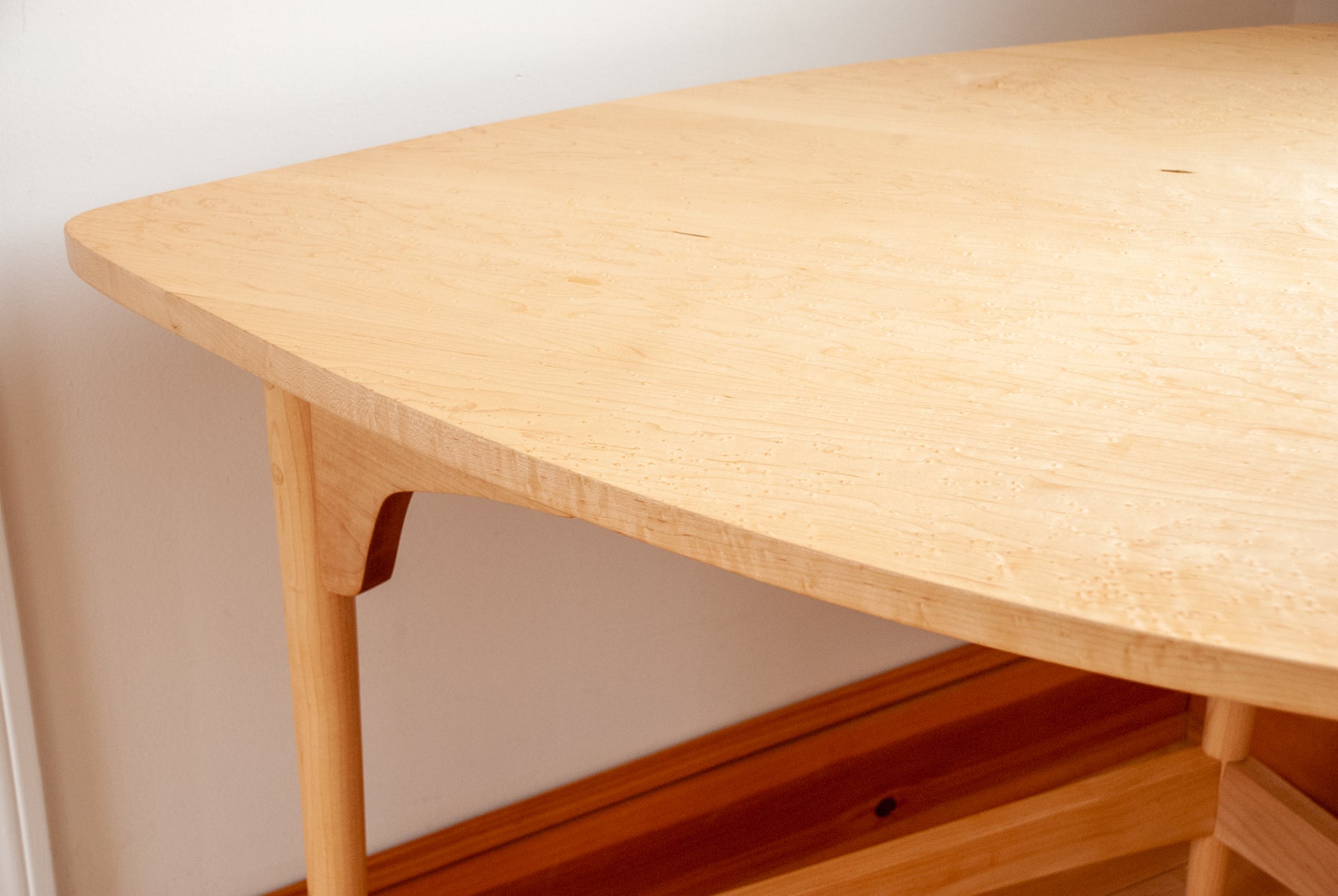 Custom desk constructed of birdseye maple. Turned legs, traditional joinery. Finished with natural oil and wax.