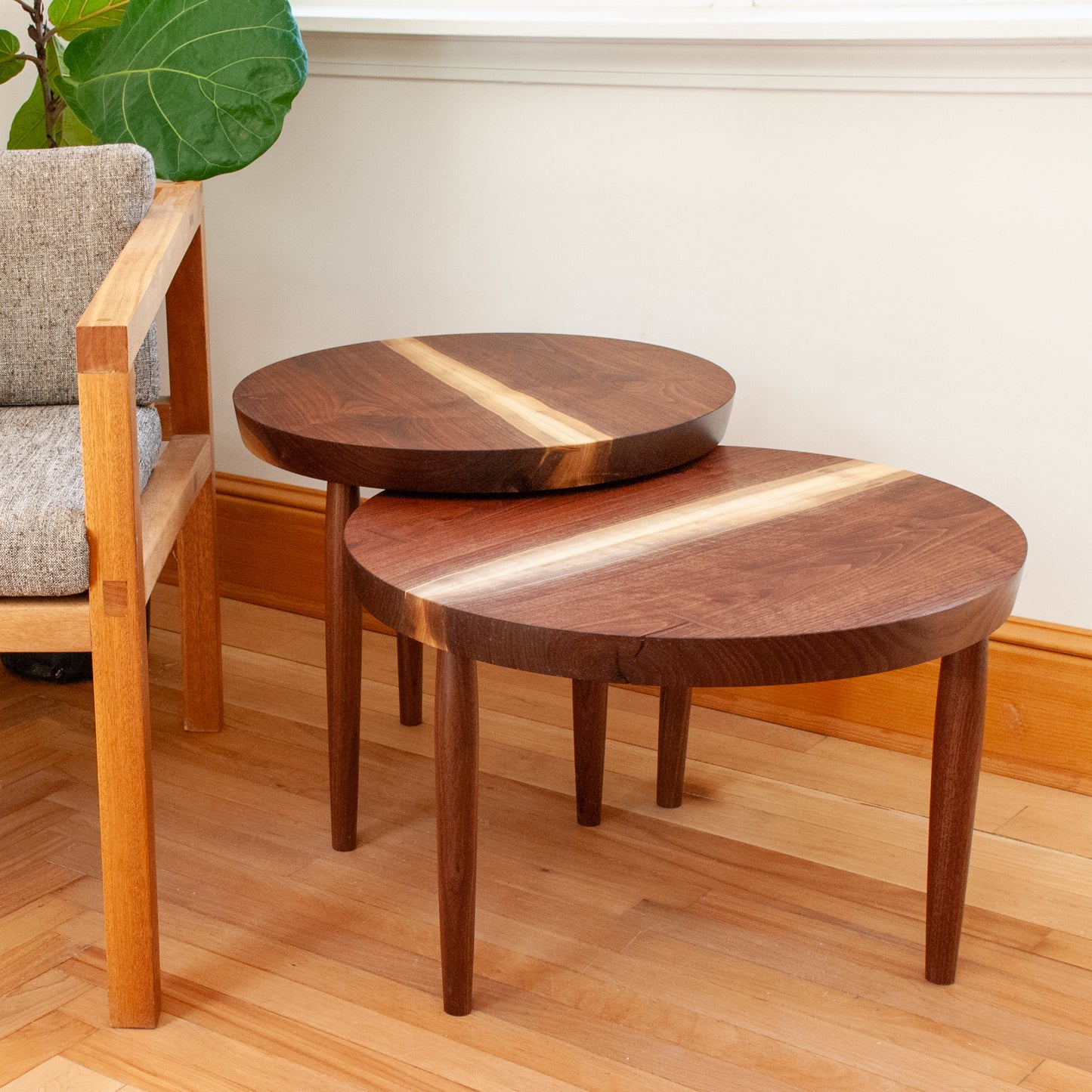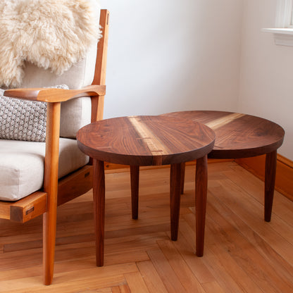 Two solid walnut wood nesting tables with bookmatched live-edge slabs joined to showcase light sapwood grain. Hand-cut butterfly joints stabilize cracks and add simple embellishments to the table tops. Hand-turned walnut cigar legs. Finished with natural oil and wax.
